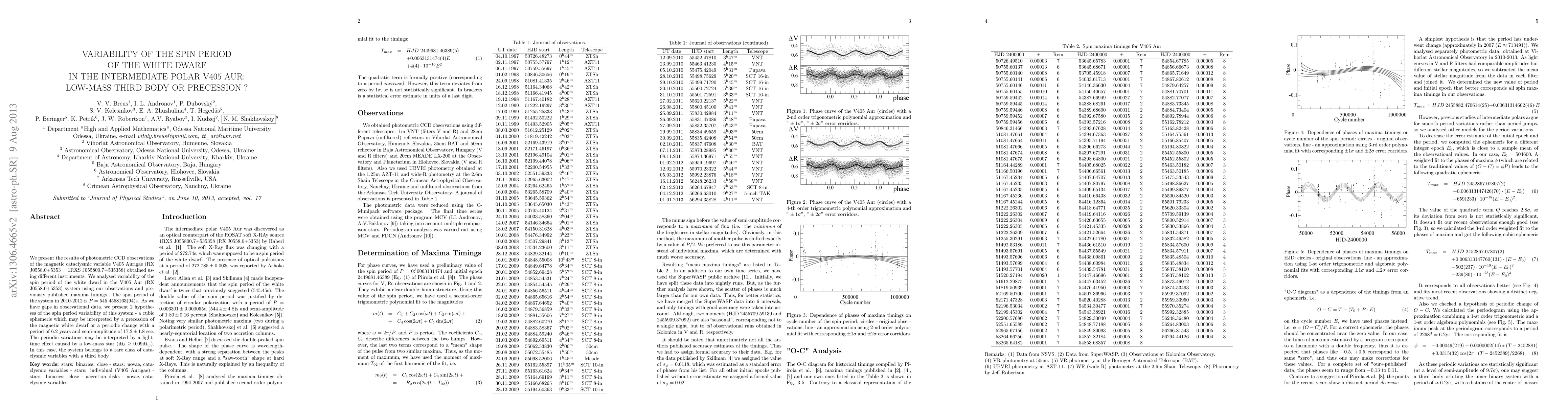 This paper investigates the spin period variability of the white dwarf in the magnetic cataclysmic variable V405 Aur, proposing two hypotheses: precession of the white dwarf or the presence of a low-mass third body causing periodic variations. The observed spin period in 2010-2012 is $P=545.4558163(94)$s, suggesting a potential light-time effect from a third body.