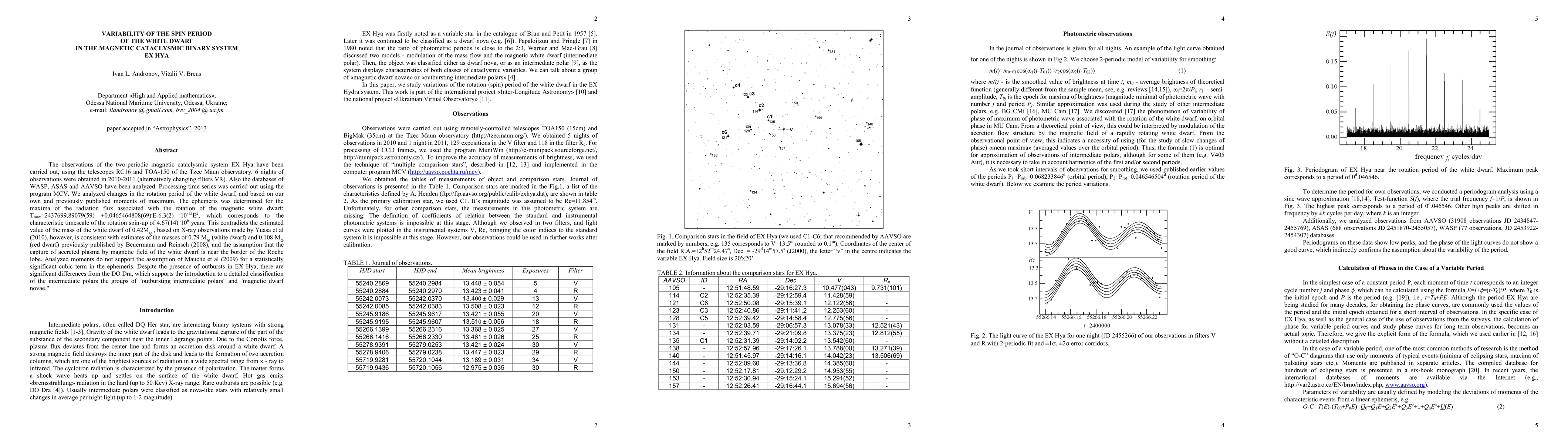 The observations of the two-periodic magnetic cataclysmic system EX Hya have been carried out, using the telescopes RC16 and TOA-150 of the Tzec Maun observatory. 6 nights of observations were obtained in 2010-2011 (alternatively changing filters VR). Also the databases of WASP, ASAS and AAVSO have been analyzed. Processing time series was carried out using the program MCV. We analyzed changes in the rotation period of the white dwarf, and based on our own and previously published moments of maximum. The ephemeris was determined for the maxima of the radiation flux associated with the rotation of the magnetic white dwarf: Tmax=2437699.89079(59) +0.0465464808(69).E-6.3(2)*10^{-13}E^2, which corresponds to the characteristic timescale of the rotation spin-up of 4.67(14)*10^6 years. This contradicts the estimated value of the mass of the white dwarf of 0.42M_\odot, based on X-ray observations made by Yuasa et al (2010), however, is consistent with estimates of the masses of 0.79 M_\odot (white dwarf) and 0.108 M_\odot (red dwarf) previously published Beuermann and Reinsch (2008), and the assumption that the capture of accreted plasma by magnetic field of the white dwarf is near the border of the Roche lobe. Analyzed moments do not support the assumption of Mauche et al (2009) for a statistically significant cubic term in the ephemeris. Despite the presence of outbursts in EX Hya, there are significant differences from the DO Dra, which supports the introduction to a detailed classification of the intermediate polars the groups of "outbursting intermediate polars" and "magnetic dwarf novae."