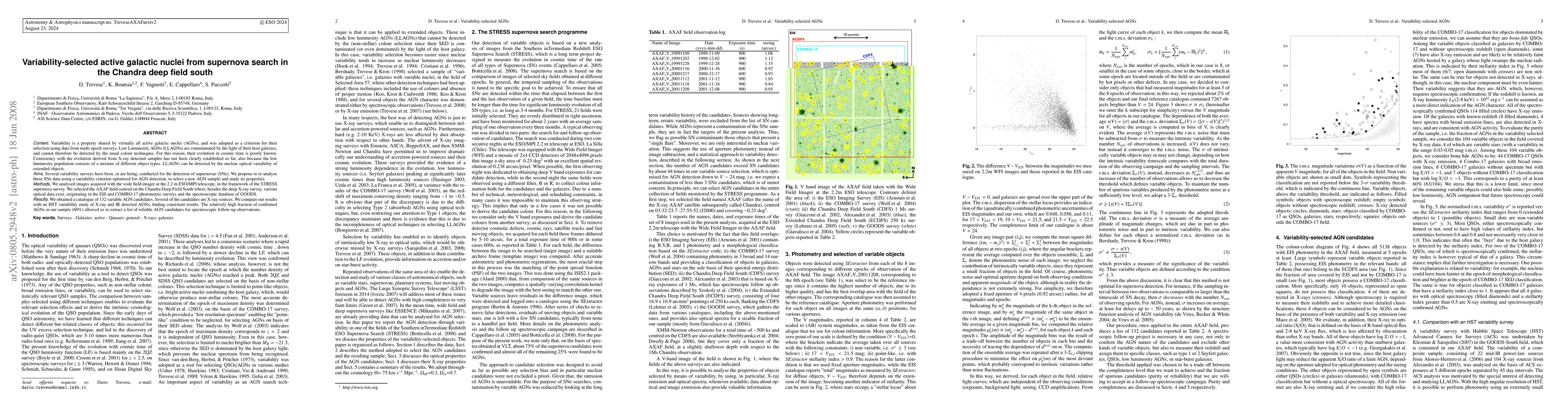 Variability is a property shared by virtually all active galactic nuclei (AGNs), and was adopted as a criterion for their selection using data from multi epoch surveys. Low Luminosity AGNs (LLAGNs) are contaminated by the light of their host galaxies, and cannot therefore be detected by the usual colour techniques. For this reason, their evolution in cosmic time is poorly known. Consistency with the evolution derived from X-ray detected samples has not been clearly established so far, also because the low luminosity population consists of a mixture of different object types. LLAGNs can be detected by the nuclear optical variability of extended objects. Several variability surveys have been, or are being, conducted for the detection of supernovae (SNe). We propose to re-analyse these SNe data using a variability criterion optimised for AGN detection, to select a new AGN sample and study its properties. We analysed images acquired with the wide field imager at the 2.2 m ESO/MPI telescope, in the framework of the STRESS supernova survey. We selected the AXAF field centred on the Chandra Deep Field South where, besides the deep X-ray survey, various optical data exist, originating in the EIS and COMBO-17 photometric surveys and the spectroscopic database of GOODS. We obtained a catalogue of 132 variable AGN candidates. Several of the candidates are X-ray sources. We compare our results with an HST variability study of X-ray and IR detected AGNs, finding consistent results. The relatively high fraction of confirmed AGNs in our sample (60%) allowed us to extract a list of reliable AGN candidates for spectroscopic follow-up observations.