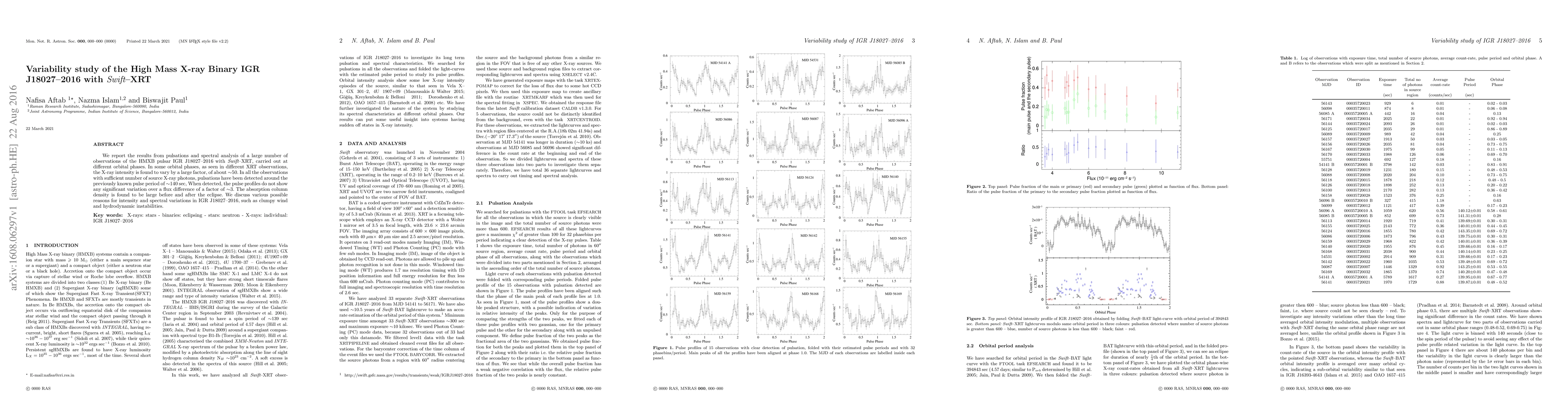 We report the results from pulsations and spectral analysis of a large number of observations of the HMXB pulsar IGR J18027--2016 with {\it Swift}--XRT, carried out at different orbital phases. In some orbital phases, as seen in different XRT observations, the X-ray intensity is found to vary by a large factor, of about $\sim$50. In all the observations with sufficient number of source X-ray photons, pulsations have been detected around the previously known pulse period of $\sim$140 sec, When detected, the pulse profiles do not show any significant variation over a flux difference of a factor of $\sim$3. The absorption column density is found to be large before and after the eclipse. We discuss various possible reasons for intensity and spectral variations in IGR J18027--2016, such as clumpy wind and hydrodynamic instabilities.