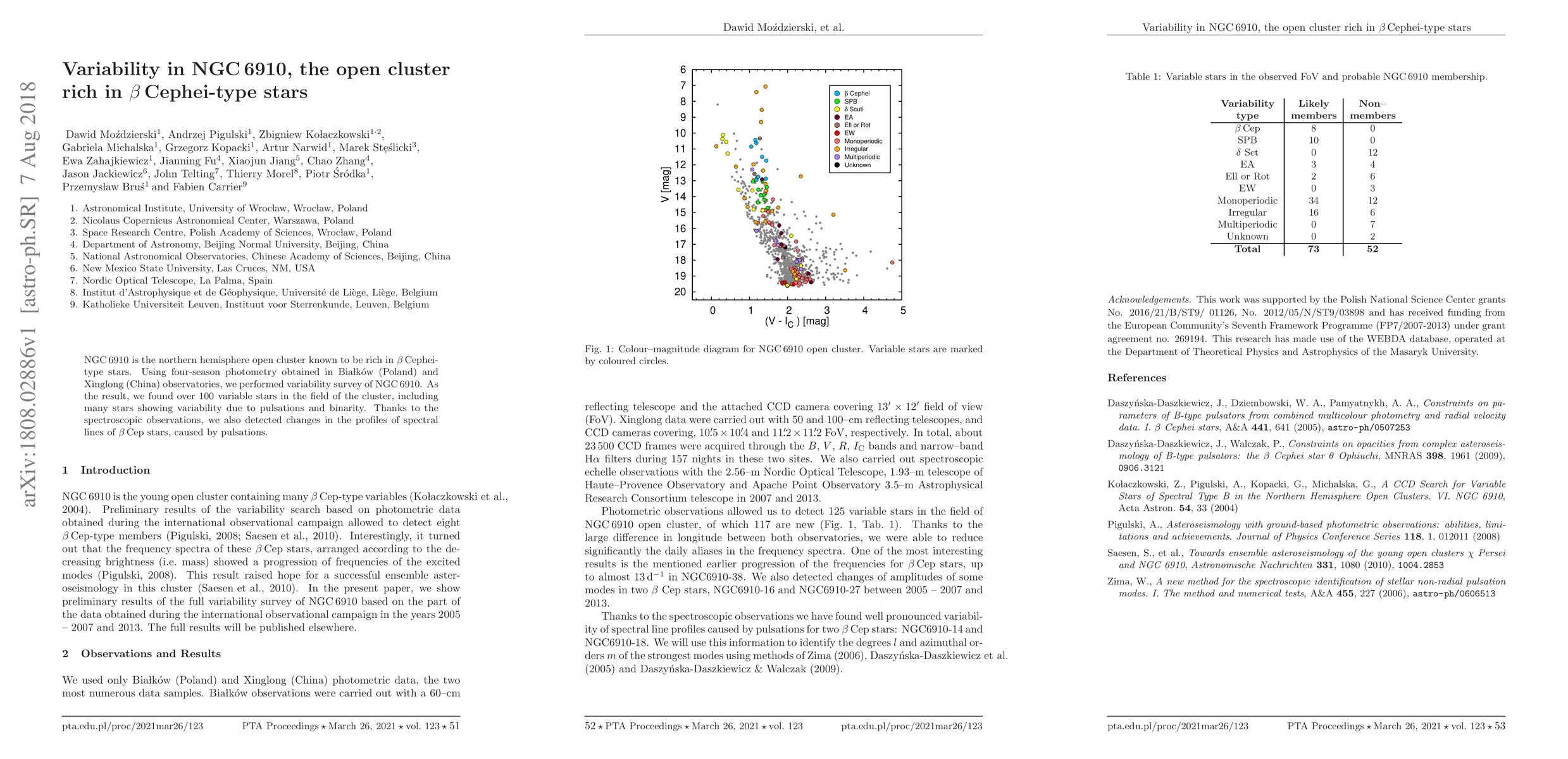 NGC 6910 is the northern hemisphere open cluster known to be rich in $\beta$ Cephei-type stars. Using four-season photometry obtained in Bia\l k\'ow (Poland) and Xinglong (China) observatories, we performed variability survey of NGC 6910. As the result, we found over 100 variable stars in the field of the cluster, including many stars showing variability due to pulsations and binarity. Thanks to the spectroscopic observations, we also detected changes in the profiles of spectral lines of $\beta$ Cep stars, caused by pulsations.