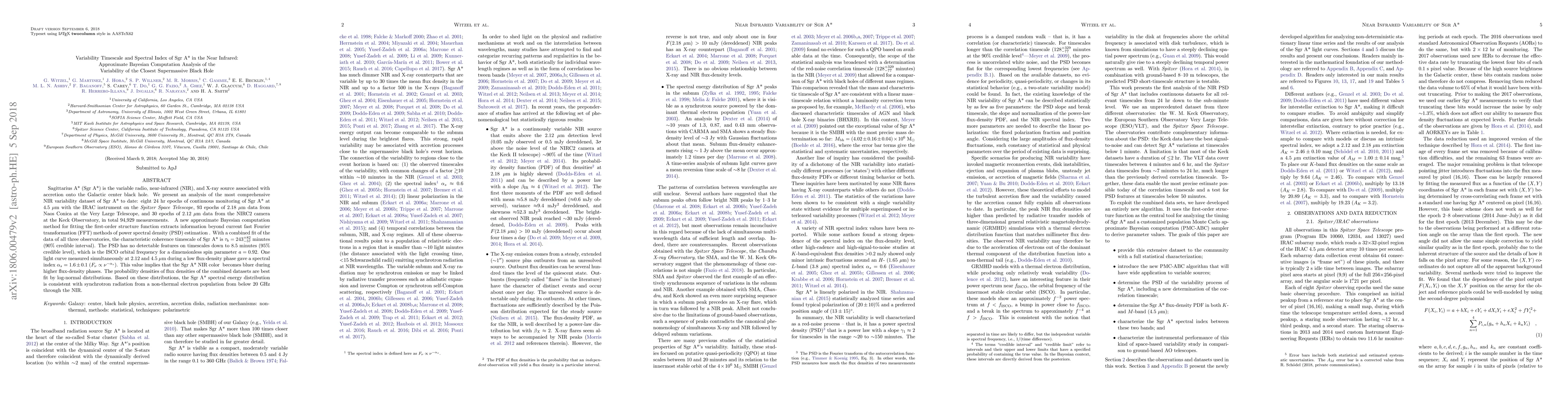 Sagittarius A* (Sgr A*) is the variable radio, near-infrared (NIR), and X-ray source associated with accretion onto the Galactic center black hole. We present an analysis of the most comprehensive NIR variability dataset of Sgr A* to date: eight 24-hour epochs of continuous monitoring of Sgr A* at 4.5 $\mu$m with the IRAC instrument on the Spitzer Space Telescope, 93 epochs of 2.18 $\mu$m data from Naos Conica at the Very Large Telescope, and 30 epochs of 2.12 $\mu$m data from the NIRC2 camera at the Keck Observatory, in total 94,929 measurements. A new approximate Bayesian computation method for fitting the first-order structure function extracts information beyond current Fast Fourier Transformation (FFT) methods of power spectral density (PSD) estimation. With a combined fit of the data of all three observatories, the characteristic coherence timescale of Sgr A* is $\tau_{b} = 243^{+82}_{-57}$ minutes ($90\%$ credible interval). The PSD has no detectable features on timescales down to 8.5 minutes ($95\%$ credible level), which is the ISCO orbital frequency for a dimensionless spin parameter $a = 0.92$. One light curve measured simultaneously at 2.12 and 4.5 $\mu$m during a low flux-density phase gave a spectral index $\alpha_s = 1.6 \pm 0.1$ ($F_\nu \propto \nu^{-\alpha_s}$). This value implies that the Sgr A* NIR color becomes bluer during higher flux-density phases. The probability densities of flux densities of the combined datasets are best fit by log-normal distributions. Based on these distributions, the Sgr A* spectral energy distribution is consistent with synchrotron radiation from a non-thermal electron population from below 20 GHz through the NIR.