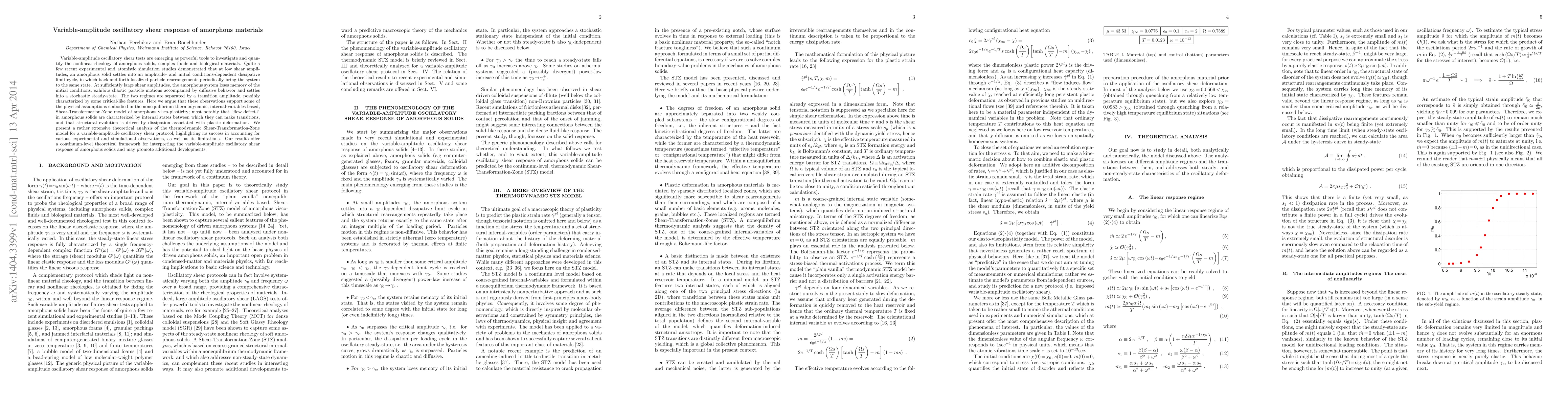 Variable-amplitude oscillatory shear tests are emerging as powerful tools to investigate and quantify the nonlinear rheology of amorphous solids, complex fluids and biological materials. Quite a few recent experimental and atomistic simulation studies demonstrated that at low shear amplitudes, an amorphous solid settles into an amplitude- and initial conditions-dependent dissipative limit cycle, in which back-and-forth localized particle rearrangements periodically bring the system to the same state. At sufficiently large shear amplitudes, the amorphous system loses memory of the initial conditions, exhibits chaotic particle motions accompanied by diffusive behavior and settles into a stochastic steady-state. The two regimes are separated by a transition amplitude, possibly characterized by some critical-like features. Here we argue that these observations support some of the physical assumptions embodied in the nonequilibrium thermodynamic, internal-variables based, Shear-Transformation-Zone model of amorphous visco-plasticity; most notably that "flow defects" in amorphous solids are characterized by internal states between which they can make transitions, and that structural evolution is driven by dissipation associated with plastic deformation. We present a rather extensive theoretical analysis of the thermodynamic Shear-Transformation-Zone model for a variable-amplitude oscillatory shear protocol, highlighting its success in accounting for various experimental and simulational observations, as well as its limitations. Our results offer a continuum-level theoretical framework for interpreting the variable-amplitude oscillatory shear response of amorphous solids and may promote additional developments.