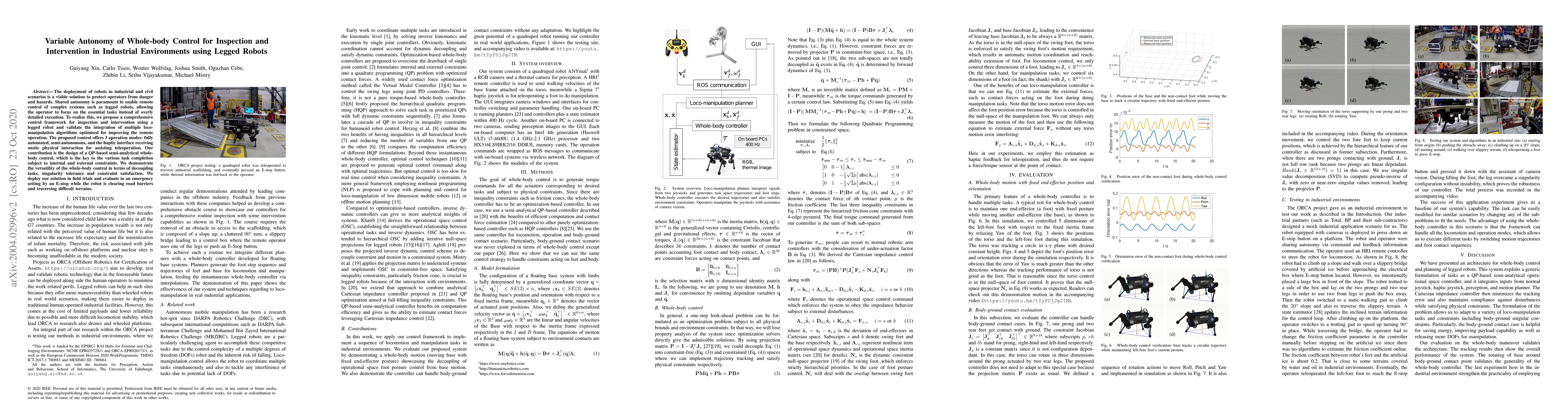 The deployment of robots in industrial and civil scenarios is a viable solution to protect operators from danger and hazards. Shared autonomy is paramount to enable remote control of complex systems such as legged robots, allowing the operator to focus on the essential tasks instead of overly detailed execution. To realize this, we propose a comprehensive control framework for inspection and intervention using a legged robot and validate the integration of multiple loco-manipulation algorithms optimised for improving the remote operation. The proposed control offers 3 operation modes: fully automated, semi-autonomous, and the haptic interface receiving onsite physical interaction for assisting teleoperation. Our contribution is the design of a QP-based semi-analytical whole-body control, which is the key to the various task completion subject to internal and external constraints. We demonstrate the versatility of the whole-body control in terms of decoupling tasks, singularity tolerance and constraint satisfaction. We deploy our solution in field trials and evaluate in an emergency setting by an E-stop while the robot is clearing road barriers and traversing difficult terrains.
