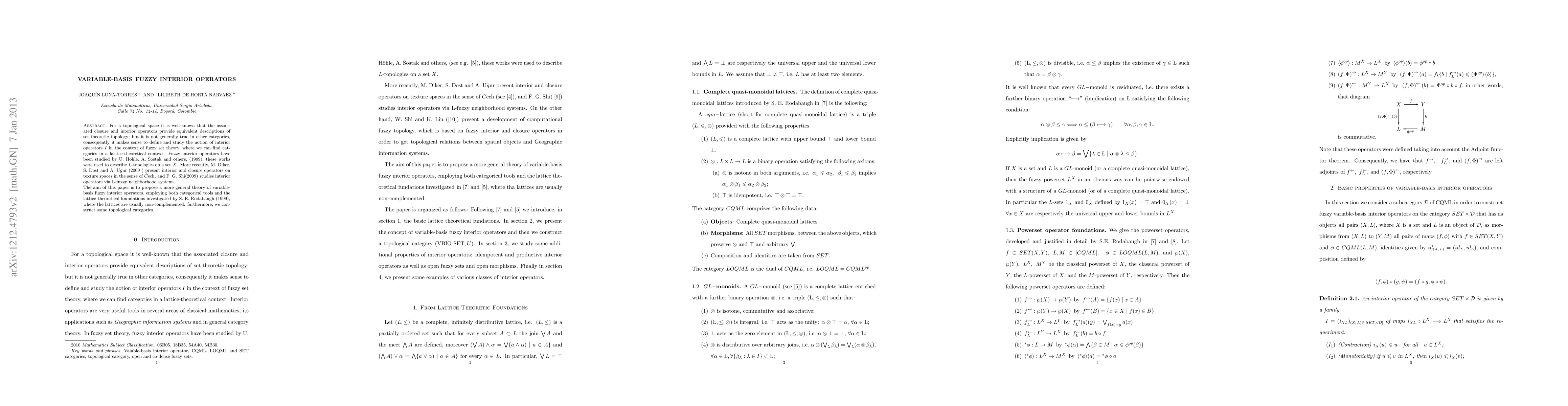For a topological space it is well-known that the associated closure and interior operators provide equivalent descriptions of set-theoretic topology; but it is not generally true in other categories, consequently it makes sense to define and study the notion of interior operators I in the context of fuzzy set theory, where we can find categories in a lattice-theoretical context. Fuzzy interior operators have been studied by U. Hohle, A. Sostak and others, (1999), these works were used to describe L-topologies on a set X. More recently, M. Diker, S. Dost and A. Ugur (2009) present interior and closure operators on texture spaces in the sense of Cech, and F. G. Shi(2009) studies interior operators via L-fuzzy neighborhood systems. The aim of this paper is to propose a more general theory of variable basis fuzzy interior operators, employing both categorical tools and the lattice theoretical foundations investigated by S. E. Rodabaugh (1999), where tha lattices are usually non-complemented. furthermore, we construct some topological categories.