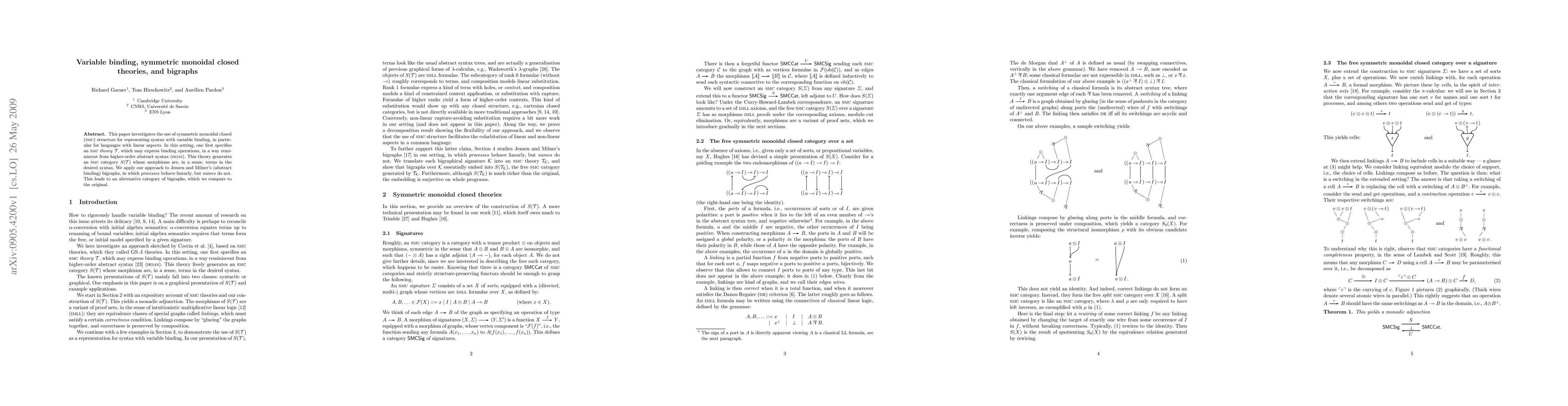 This paper investigates the use of symmetric monoidal closed (SMC) structure for representing syntax with variable binding, in particular for languages with linear aspects. In our setting, one first specifies an SMC theory T, which may express binding operations, in a way reminiscent from higher-order abstract syntax. This theory generates an SMC category S(T) whose morphisms are, in a sense, terms in the desired syntax. We apply our approach to Jensen and Milner's (abstract binding) bigraphs, which are linear w.r.t. processes. This leads to an alternative category of bigraphs, which we compare to the original.