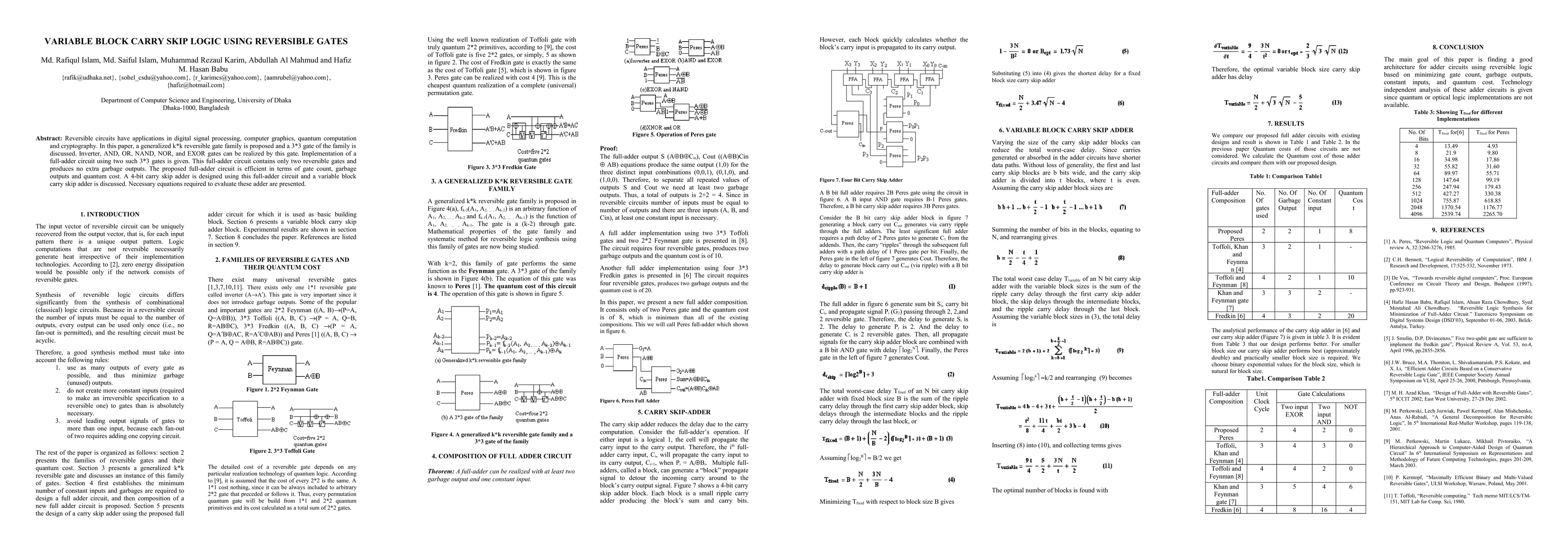 The proposed full adder circuit using the Peres gate and the carry skip adder with variable block sizes are novel contributions to the field of reversible logic.