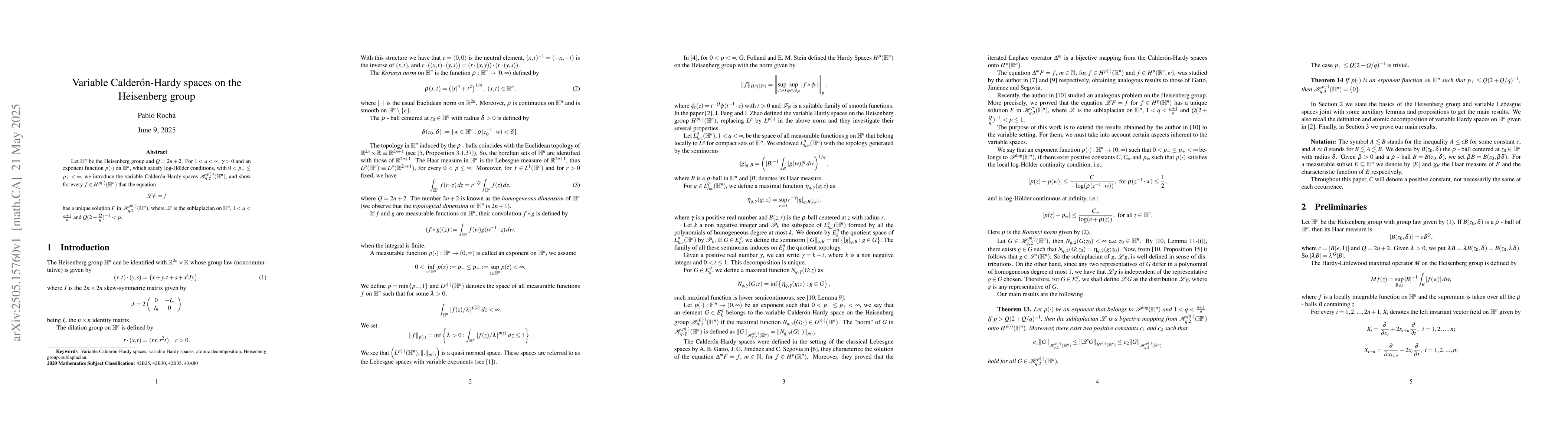 The introduction and analysis of variable Calderón-Hardy spaces $\mathcal{H}^{p(\cdot)}_{q, \gamma}(\mathbb{H}^{n})$ and the proof of unique solvability for the sublaplacian equation under specified conditions.