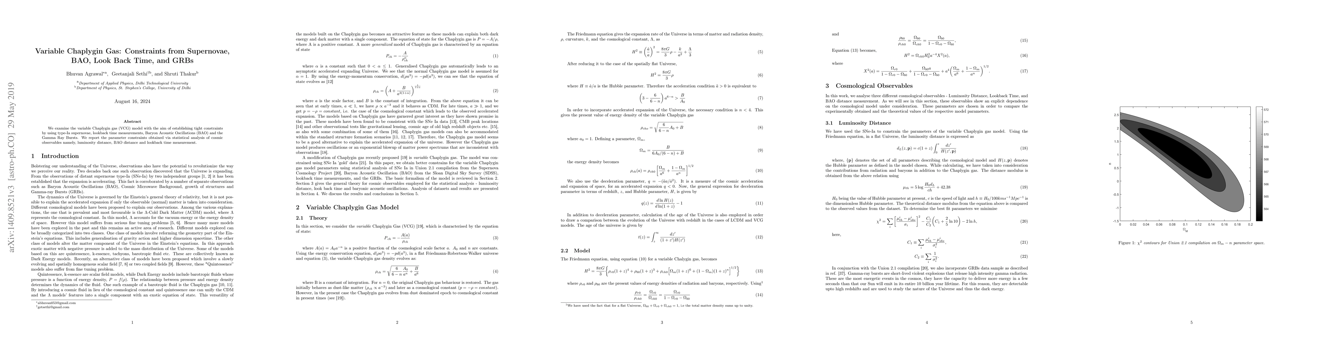 This paper investigates the variable Chaplygin gas model, aiming to derive constraints using type-Ia supernovae, Baryon Acoustic Oscillations, lookback time, and Gamma Ray Bursts. The study reports parameter constraints obtained through statistical analysis of cosmic observables.
