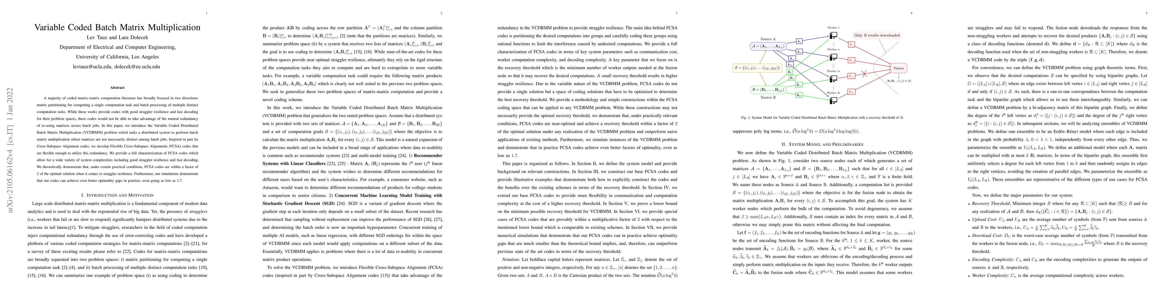 This paper introduces the Variable Coded Distributed Batch Matrix Multiplication (VCDBMM) problem, developing Flexible Cross-Subspace Alignment (FCSA) codes to efficiently reuse matrices across batch jobs. FCSA codes achieve good straggler resilience and fast decoding, theoretically proving near-optimality in resilience and demonstrating practical optimality gaps as low as 1.7.