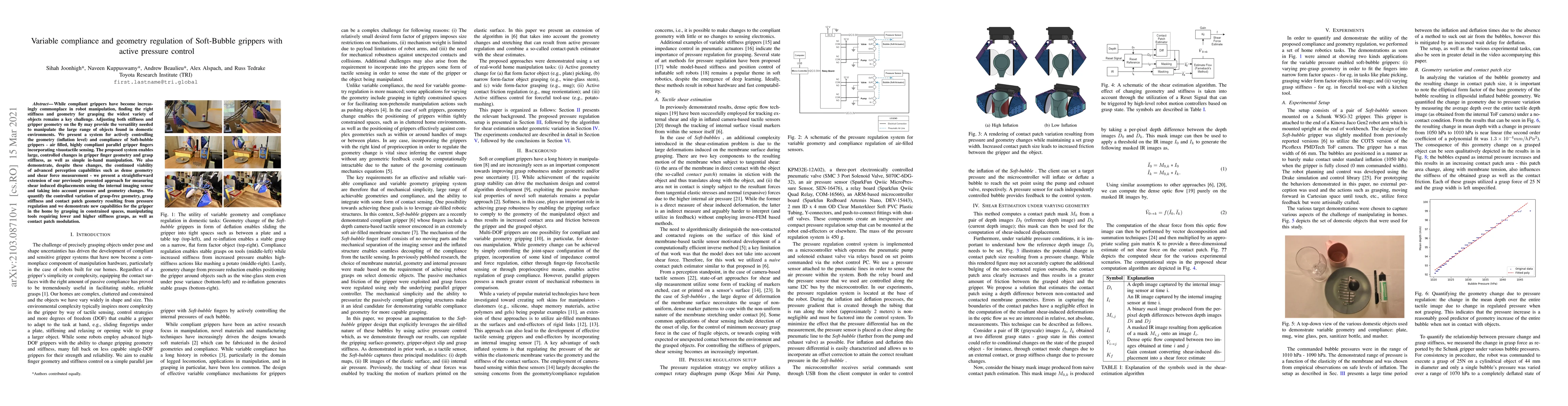 While compliant grippers have become increasingly commonplace in robot manipulation, finding the right stiffness and geometry for grasping the widest variety of objects remains a key challenge. Adjusting both stiffness and gripper geometry on the fly may provide the versatility needed to manipulate the large range of objects found in domestic environments. We present a system for actively controlling the geometry (inflation level) and compliance of Soft-bubble grippers - air filled, highly compliant parallel gripper fingers incorporating visuotactile sensing. The proposed system enables large, controlled changes in gripper finger geometry and grasp stiffness, as well as simple in-hand manipulation. We also demonstrate, despite these changes, the continued viability of advanced perception capabilities such as dense geometry and shear force measurement - we present a straightforward extension of our previously presented approach for measuring shear induced displacements using the internal imaging sensor and taking into account pressure and geometry changes. We quantify the controlled variation of grasp-free geometry, grasp stiffness and contact patch geometry resulting from pressure regulation and we demonstrate new capabilities for the gripper in the home by grasping in constrained spaces, manipulating tools requiring lower and higher stiffness grasps, as well as contact patch modulation.