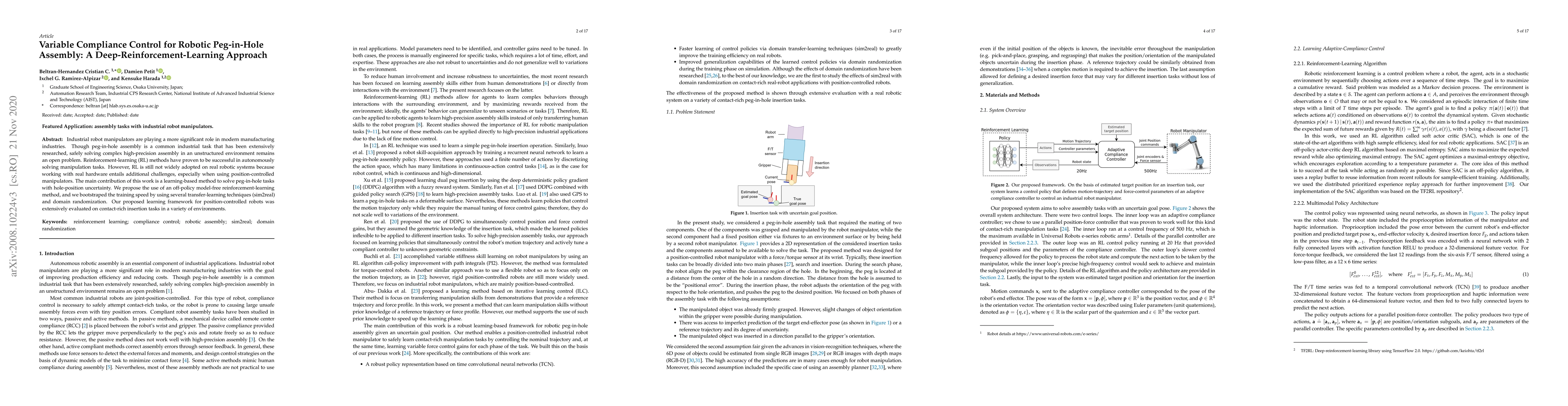 This paper proposes a deep reinforcement learning approach for robotic peg-in-hole assembly, addressing position uncertainty of the hole. The method employs an off-policy model-free RL technique enhanced by transfer learning and domain randomization, successfully tackling complex insertion tasks in varied environments.
