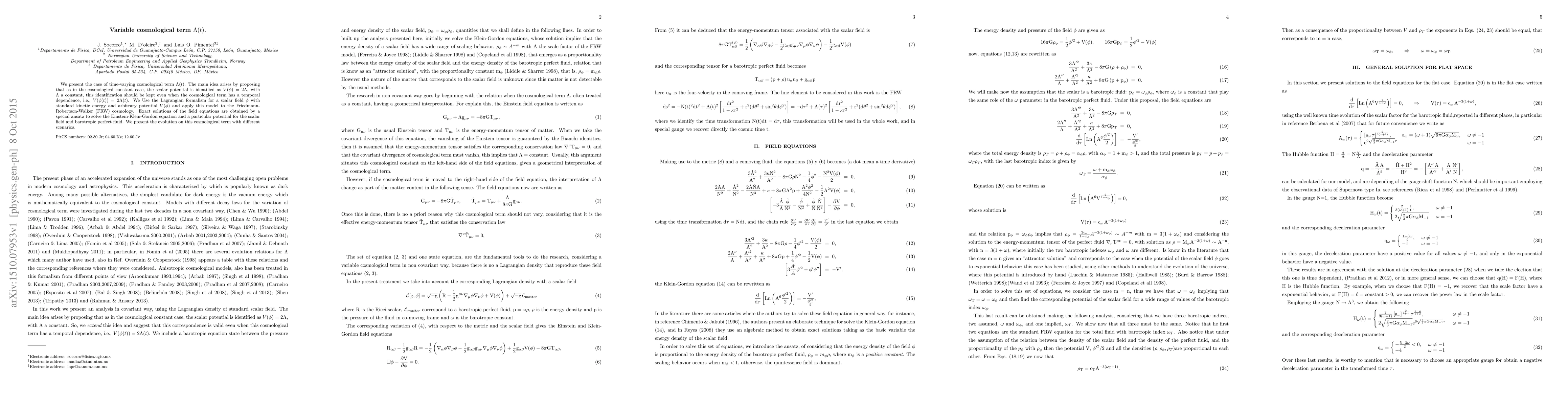 We present the case of time-varying cosmological term $\Lambda(t)$. The main idea arises by proposing that as in the cosmological constant case, the scalar potential is identified as $ V(\phi)=2\Lambda$, with $\Lambda$ a constant, this identification should be kept even when the cosmological term has a temporal dependence, i.e., $ V(\phi(t))=2\Lambda(t)$. We Use the Lagrangian formalism for a scalar field $\phi$ with standard kinetic energy and arbitrary potential $V(\phi)$ and apply this model to the Friedmann-Robertson-Walker (FRW)cosmology. Exact solutions of the field equations are obtained by a special ansatz to solve the Einstein-Klein-Gordon equation and a particular potential for the scalar field and barotropic perfect fluid. We present the evolution on this cosmological term with different scenarios.