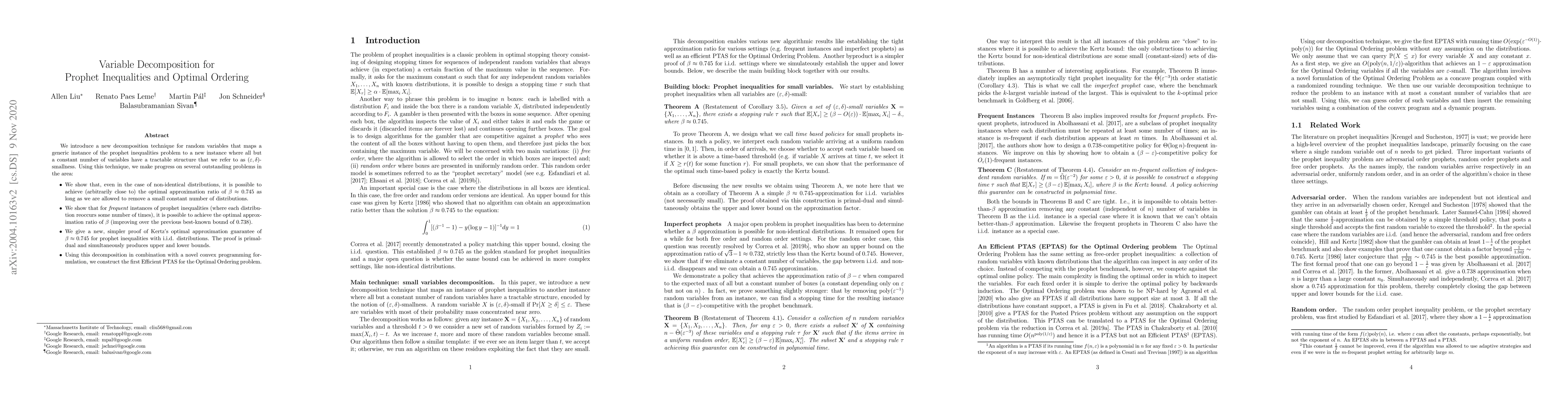 We introduce a new decomposition technique for random variables that maps a generic instance of the prophet inequalities problem to a new instance where all but a constant number of variables have a tractable structure that we refer to as $(\varepsilon, \delta)$-smallness. Using this technique, we make progress on several outstanding problems in the area: - We show that, even in the case of non-identical distributions, it is possible to achieve (arbitrarily close to) the optimal approximation ratio of $\beta \approx 0.745$ as long as we are allowed to remove a small constant number of distributions. - We show that for frequent instances of prophet inequalities (where each distribution reoccurs some number of times), it is possible to achieve the optimal approximation ratio of $\beta$ (improving over the previous best-known bound of $0.738$). - We give a new, simpler proof of Kertz's optimal approximation guarantee of $\beta \approx 0.745$ for prophet inequalities with i.i.d. distributions. The proof is primal-dual and simultaneously produces upper and lower bounds. - Using this decomposition in combination with a novel convex programming formulation, we construct the first Efficient PTAS for the Optimal Ordering problem.