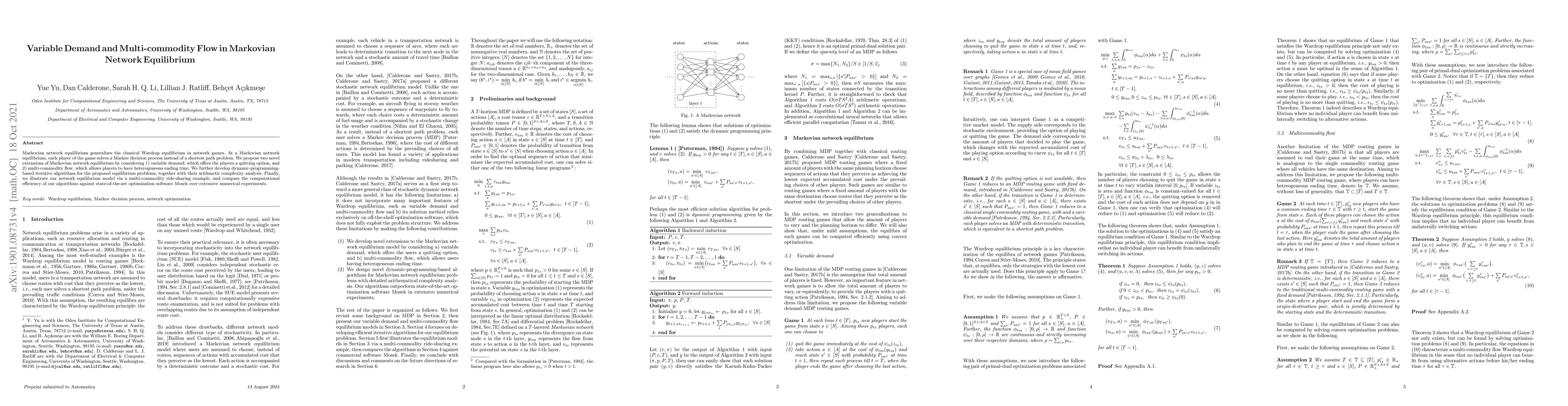 This paper extends Markovian network equilibrium to handle variable demand and multi-commodity flow, proposing dynamic-programming-based algorithms and analyzing their complexity. It demonstrates the model's application through a ride-sharing example and compares algorithm efficiency against Mosek.