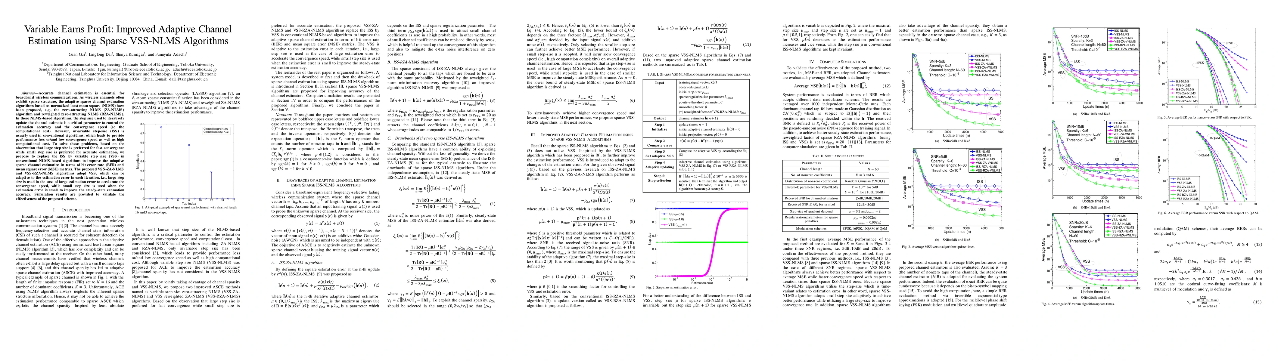 This paper proposes adaptive sparse channel estimation algorithms using variable step size (VSS) in the normalized least mean square (NLMS) framework to improve performance in terms of bit error rate (BER) and mean square error (MSE). The VSS-NLMS algorithms adaptively adjust the step size based on the estimation error, enhancing convergence speed and accuracy compared to conventional invariable step size (ISS) methods.