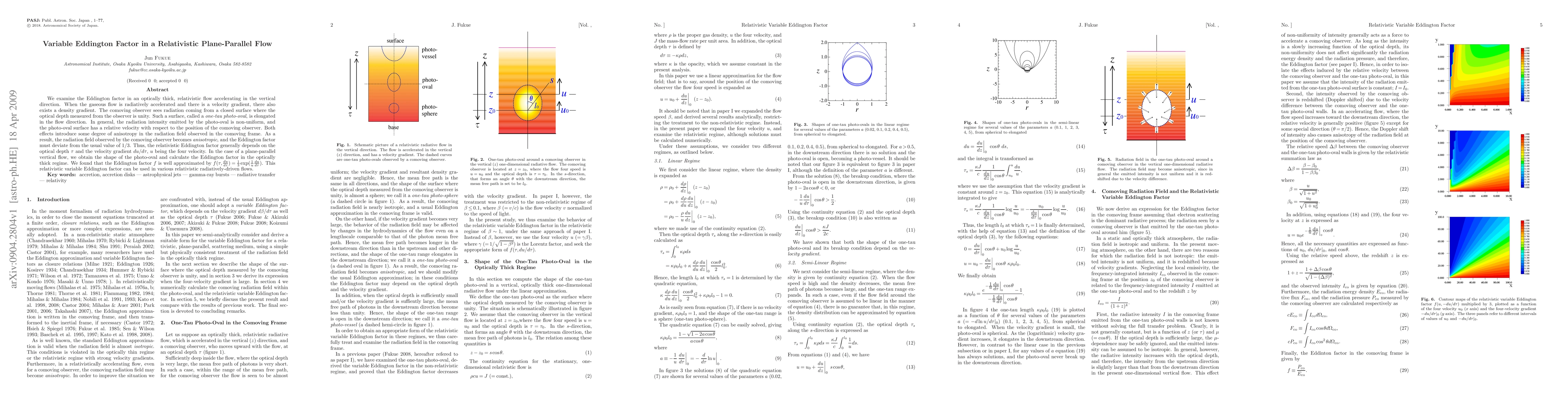 We examine the Eddington factor in an optically thick, relativistic flow accelerating in the vertical direction. % When the gaseous flow is radiatively accelerated and there is a velocity gradient, there also exists a density gradient. The comoving observer sees radiation coming from a closed surface where the optical depth measured from the observer is unity. Such a surface, called a {\it one-tau photo-oval}, is elongated in the flow direction. In general, the radiation intensity emitted by the photo-oval is non-uniform, and the photo-oval surface has a relative velocity with respect to the position of the comoving observer. Both effects introduce some degree of anisotropy in the radiation field observed in the comoving frame. As a result, the radiation field observed by the comoving observer becomes {\it anisotropic}, and the Eddington factor must deviate from the usual value of 1/3. Thus, the relativistic Eddington factor generally depends on the optical depth $\tau$ and the velocity gradient $du/d\tau$, $u$ being the four velocity. % In the case of a plane-parallel vertical flow, we obtain the shape of the photo-oval and calculate the Eddington factor in the optically thick regime. We found that the Eddington factor $f$ is well approximated by $f(\tau, \frac{du}{d\tau}) = {1/3} \exp (\frac{1}{u} \frac{du}{d\tau}) $. % This relativistic variable Eddington factor can be used in various relativistic radiatively-driven flows.