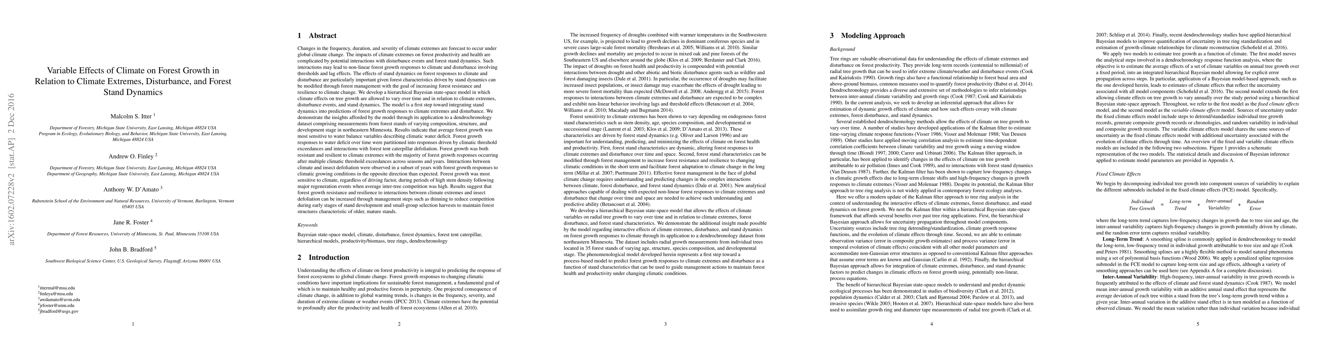 This study uses a hierarchical Bayesian model to assess how forest growth in northeastern Minnesota responds to climate extremes, disturbances, and stand dynamics. Findings show that forest growth is most sensitive to water deficit, particularly during periods of high stem density, and that management practices like thinning and selective harvesting can enhance forest resistance and resilience to climate impacts.