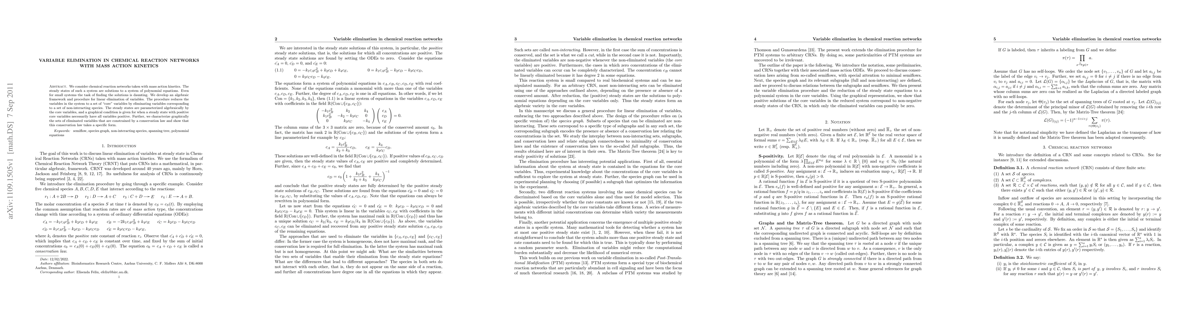 This paper develops an algebraic framework for variable elimination in chemical reaction networks governed by mass action kinetics, simplifying the system to a set of "core" variables. It provides a graphical condition for ensuring positivity of all variables and characterizes the constraints imposed by conservation laws.