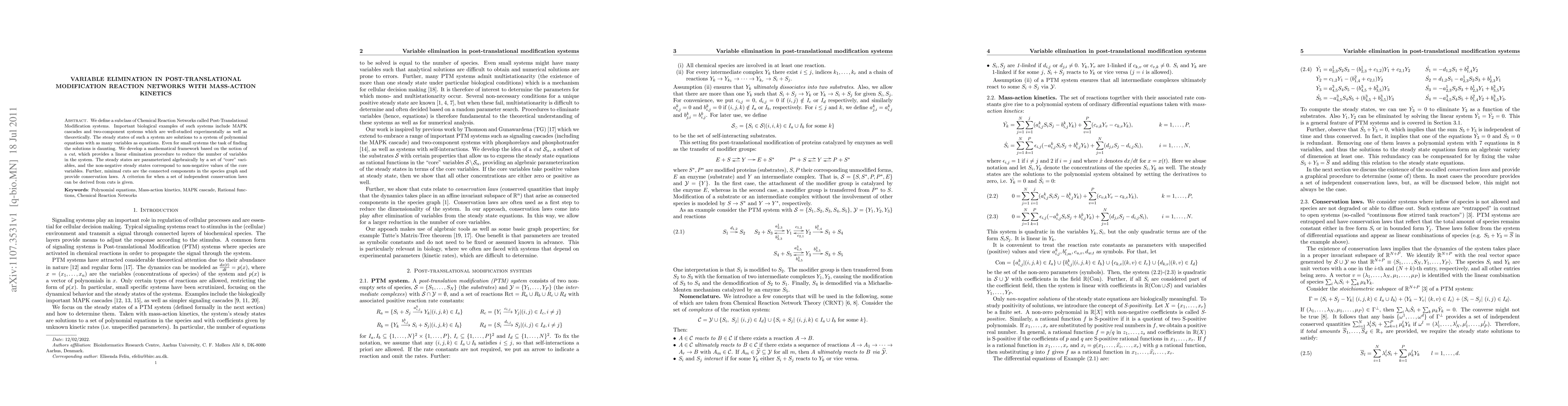 This paper introduces a mathematical framework for analyzing steady states in post-translational modification reaction networks using variable elimination. It leverages the concept of cuts to reduce the complexity of polynomial equations, allowing for algebraic parameterization of steady states by core variables and derivation of conservation laws.