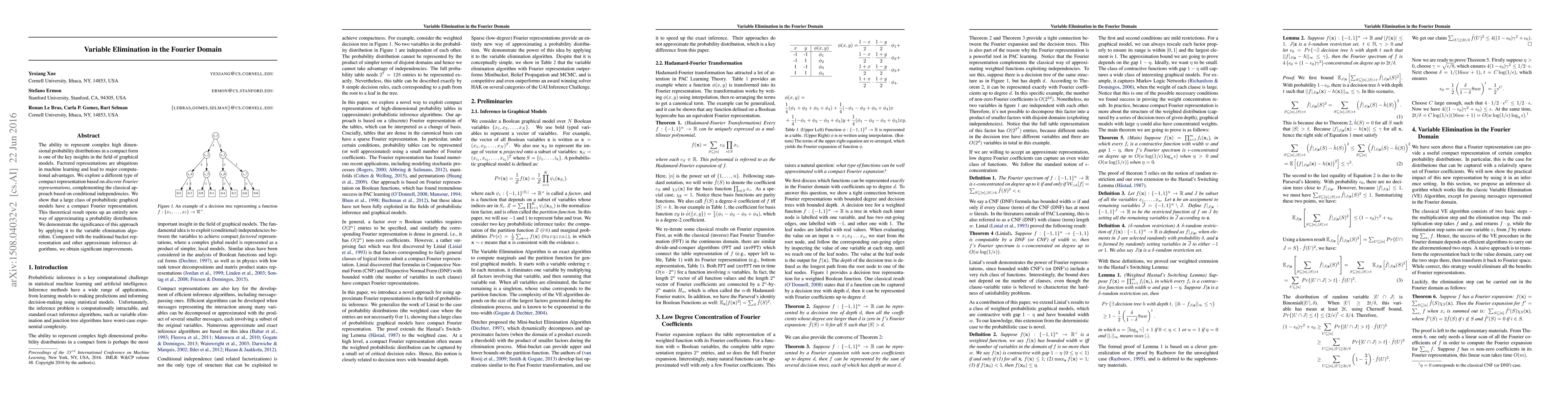 This paper introduces a compact representation of high-dimensional probability distributions using discrete Fourier transforms, offering a novel alternative to traditional conditional independencies. The authors demonstrate significant improvements in variable elimination algorithms when using this Fourier-based approach compared to classical methods.