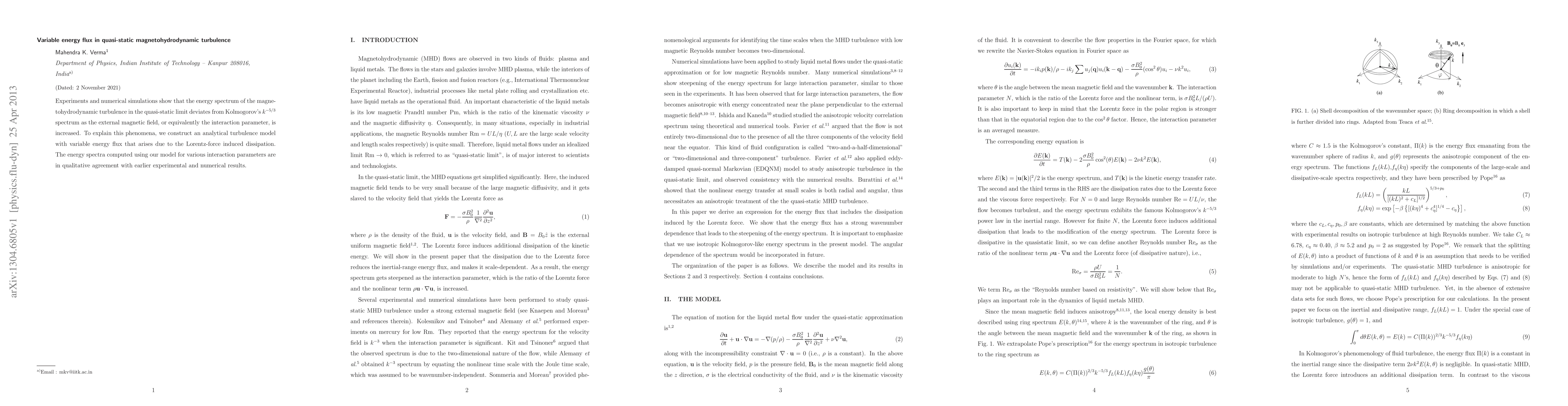 This paper presents an analytical model explaining deviations in magnetohydrodynamic turbulence from Kolmogorov's $k^{-5/3}$ spectrum under increased magnetic fields, attributing the changes to Lorentz-force induced dissipation and variable energy flux. The model's computed spectra match previous experimental and numerical findings.
