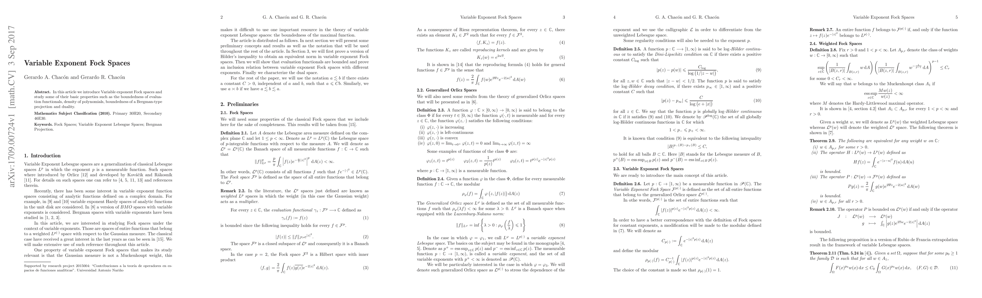 This paper introduces Variable Exponent Fock spaces, examining their fundamental properties including evaluation functional boundedness, polynomial density, Bergman-type projection boundedness, and duality.