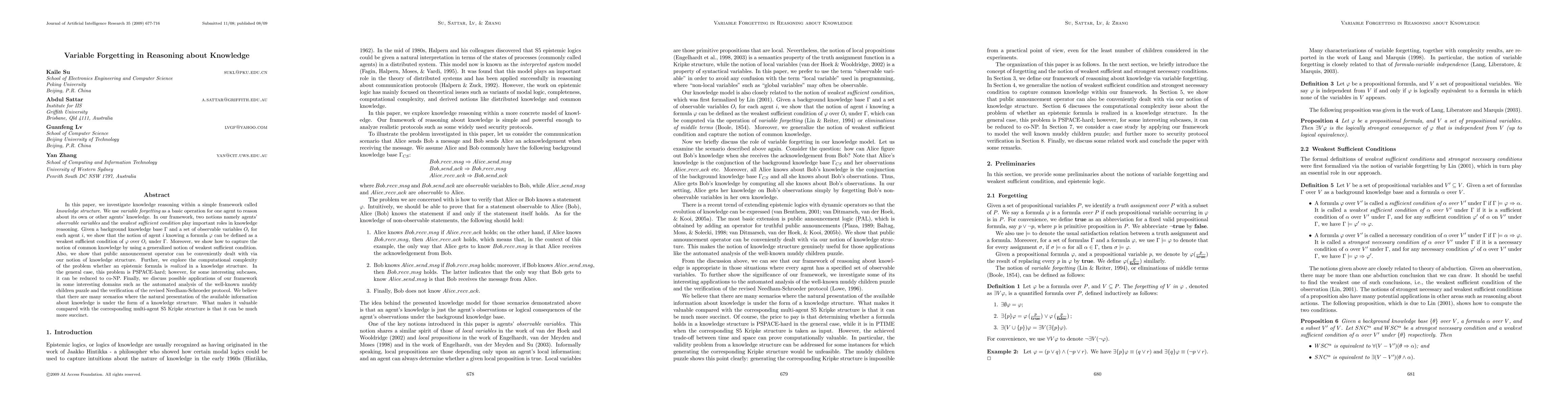 The paper investigates knowledge reasoning within a framework called knowledge structure, utilizing variable forgetting as a fundamental operation for agents to reason about their or others' knowledge. It introduces notions such as agents' observable variables and the weakest sufficient condition to define an agent's knowledge.