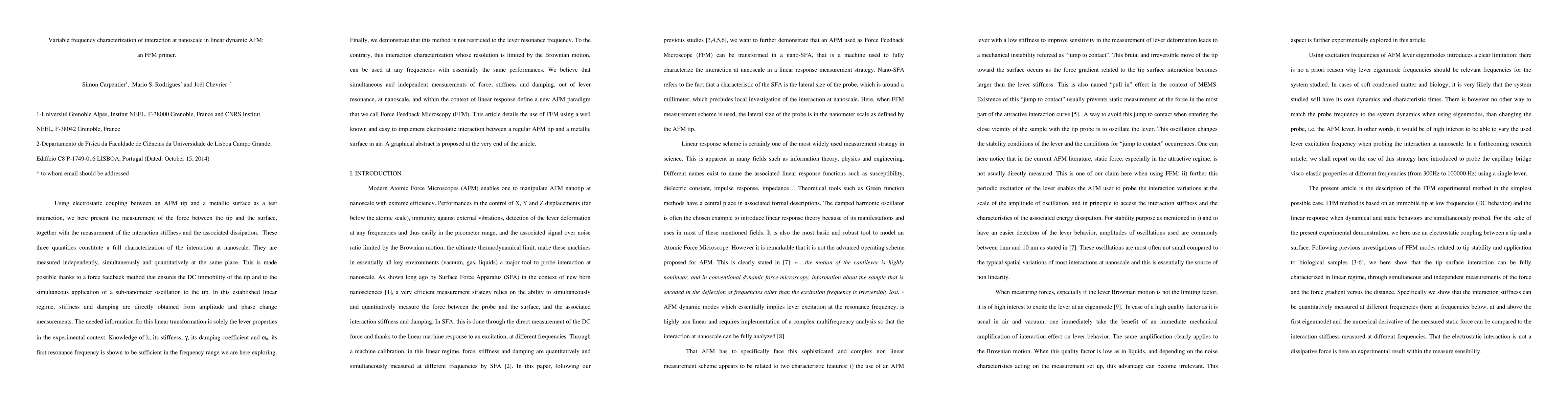 Using electrostatic coupling between an AFM tip and a metallic surface as a test interaction, we here present the measurement of the force between the tip and the surface, together with the measurement of the interaction stiffness and the associated dissipation. These three quantities constitute a full characterization of the interaction at nanoscale. They are measured independently, simultaneously and quantitatively at the same place. This is made possible thanks to a force feedback method that ensures the DC immobility of the tip and to the simultaneous application of a sub-nanometer oscillation to the tip. In this established linear regime, stiffness and damping are directly obtained from amplitude and phase change measurements. The needed information for this linear transformation is solely the lever properties in the experimental context. Knowledge of k, its stiffness, its damping coefficient and Q0, its first resonance frequency is shown to be sufficient in the frequency range we are here exploring. Finally, we demonstrate that this method is not restricted to the lever resonance frequency. To the contrary, this interaction characterization whose resolution is limited by the Brownian motion, can be used at any frequencies with essentially the same performances. We believe that simultaneous and independent measurements of force, stiffness and damping, out of lever resonance, at nanoscale, and within the context of linear response define a new AFM paradigm that we call Force Feedback Microscopy (FFM). This article details the use of FFM using a well known and easy to implement electrostatic interaction between a regular AFM tip and a metallic surface in air.