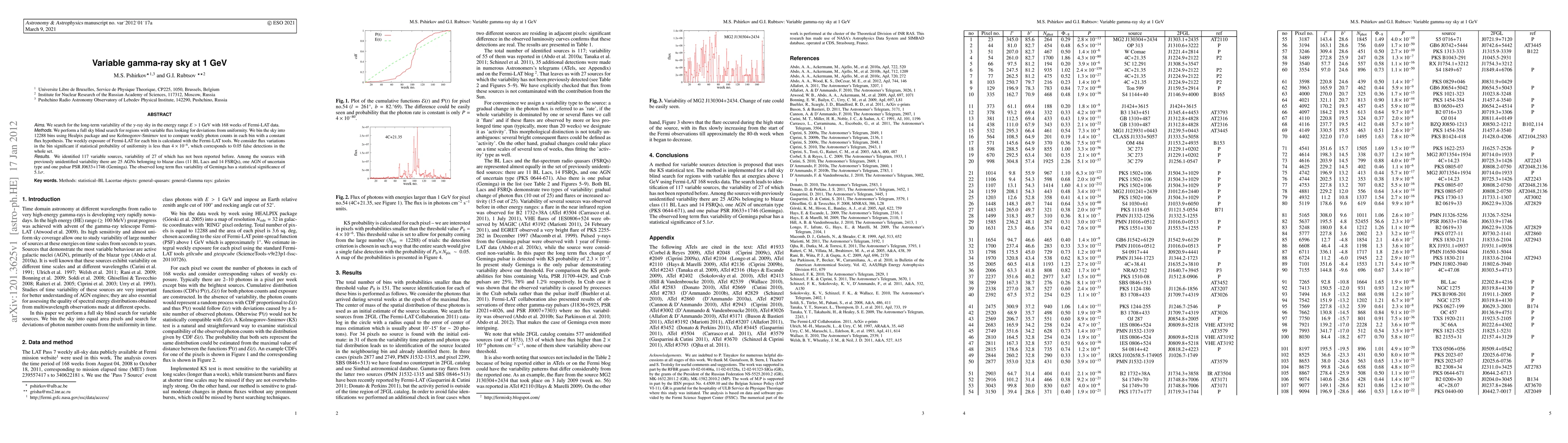We search for the long-term variability of the \gamma-ray sky in the energy range E > 1 GeV with 168 weeks of Fermi-LAT data. We perform a full sky blind search for regions with variable flux looking for deviations from uniformity. We bin the sky into 12288 bins using Healpix package and use Kolmogorov-Smirnov test to compare weekly photon counts in each bin with a constant flux hypothesis. The weekly exposure of Fermi-LAT for each bin is calculated with the Fermi-LAT tools. We consider flux variations in the bin significant if statistical probability of uniformity is less than 4e-6, which corresponds to 0.05 false detections in the whole set. We identified 117 variable sources, variability of 27 of which has not been reported before. Among the sources with previously unidentified variability there are 25 AGNs belonging to blazar class (11 BL Lacs and 14 FSRQs), one AGN of uncertain type and one pulsar PSR J0633+1746 (Geminga). The observed long term flux variability of Geminga has a statistical significance of 5.1\sigma.
