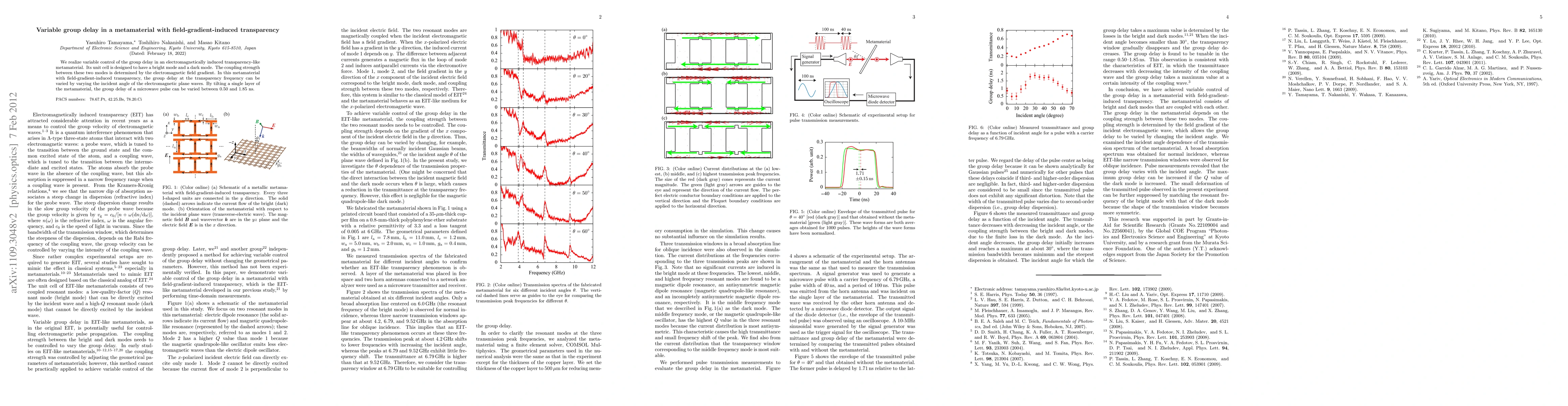 This research demonstrates a metamaterial that achieves variable group delay through electromagnetically induced transparency, where the coupling between bright and dark modes is controlled by field gradients. By adjusting the incident angle of electromagnetic waves or tilting the metamaterial layer, the group delay of microwave pulses can be altered between 0.50 and 1.85 ns.