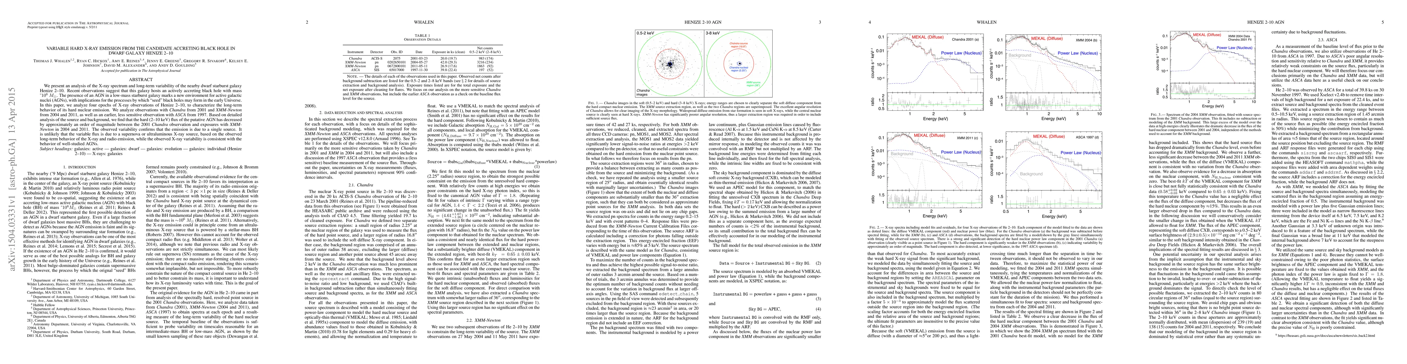 This paper analyzes the X-ray spectrum and long-term variability of the dwarf galaxy Henize 2-10, suggesting it hosts an actively accreting black hole. The hard X-ray emission from the putative AGN has decreased significantly over the observed epochs, indicating variability consistent with AGN behavior rather than other sources like supernovae.
