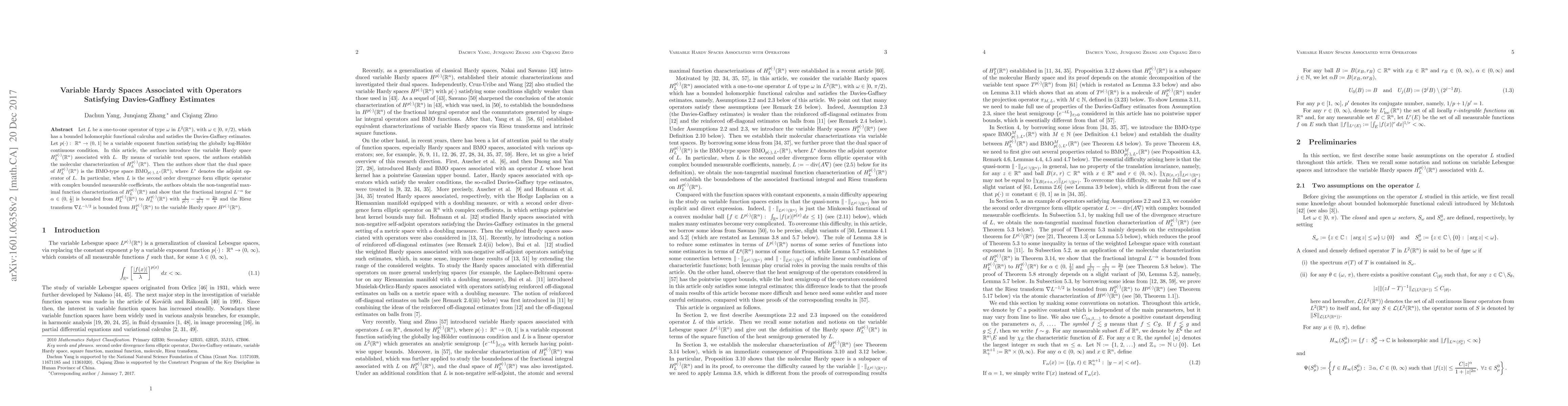 This paper introduces variable Hardy spaces $H^{p(\cdot)}_L(\mathbb{R}^n)$ associated with operators $L$ satisfying Davies-Gaffney estimates. The authors establish a molecular characterization using variable tent spaces and show that the dual space is ${\rm BMO}_{p(\cdot),\,L^\ast}(\mathbb{R}^n)$. They also prove boundedness results for fractional integrals and Riesz transforms within these spaces.