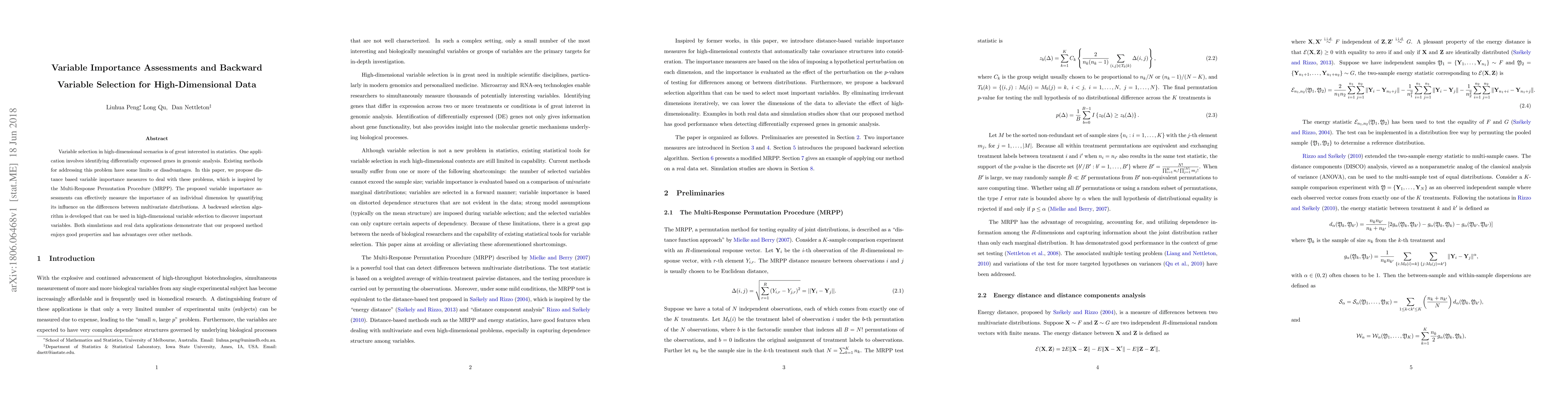 This paper proposes a novel distance-based variable importance measure inspired by the Multi-Response Permutation Procedure (MRPP) for high-dimensional data, along with a backward selection algorithm to identify significant variables. The method's effectiveness is demonstrated through simulations and real data applications, showing advantages over existing techniques.