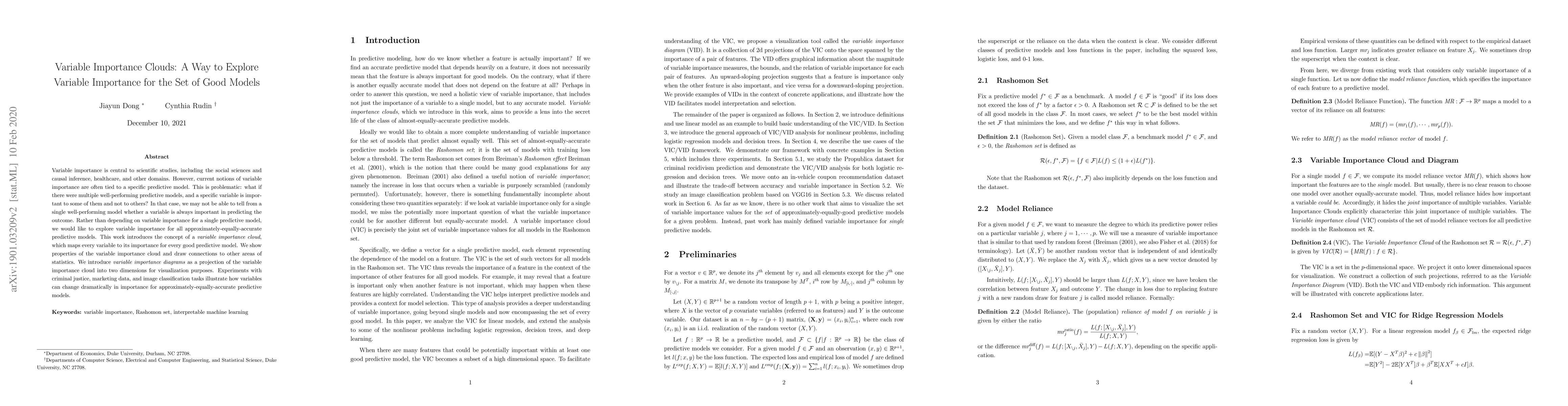 This paper introduces the concept of a variable importance cloud to explore variable importance across multiple well-performing predictive models, rather than relying on a single model. It visualizes variable importance through importance diagrams, demonstrating the variability in importance across models using real-world datasets.