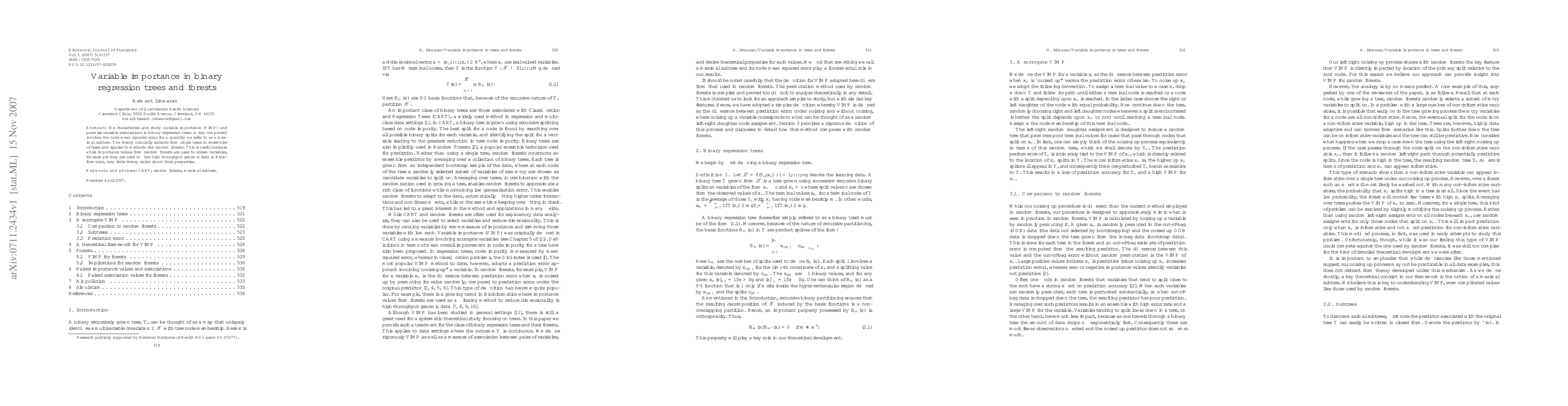 This paper develops a theoretical framework for assessing variable importance (VIMP) in binary regression trees and forests, focusing on maximal subtrees and extending the analysis to random forests. It aims to provide a deeper understanding of the properties of importance values used in applications like genomic data filtering in bioinformatics.