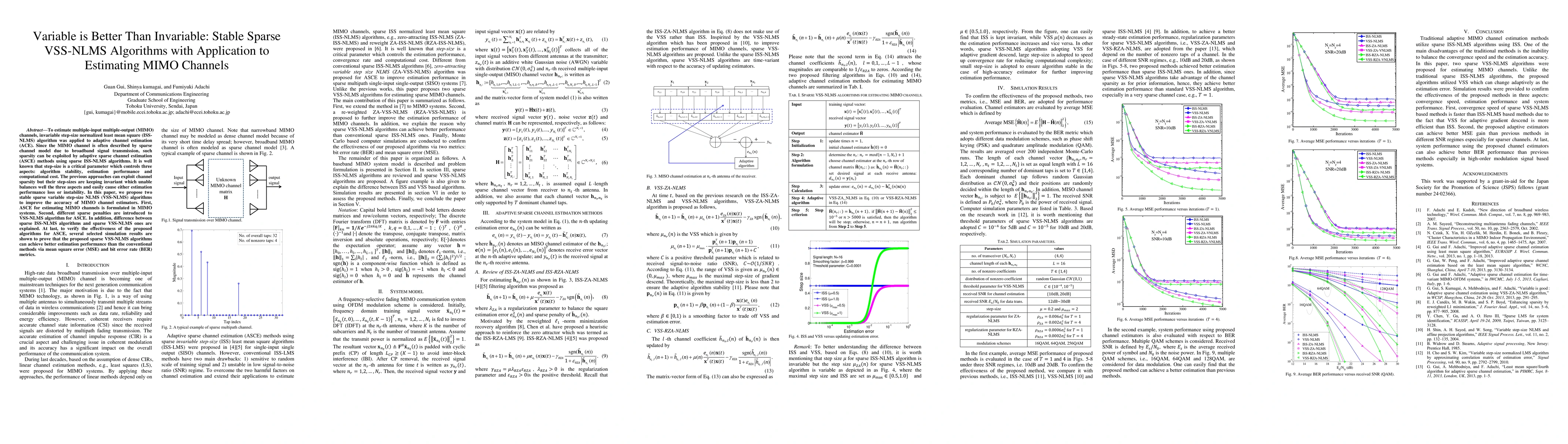 This paper proposes two stable sparse variable step-size NLMS algorithms to enhance the accuracy of MIMO channel estimators, contrasting them with conventional invariable step-size methods to achieve better balance between stability, performance, and computational cost. Simulation results demonstrate improved estimation performance via lower mean square error and bit error rate.