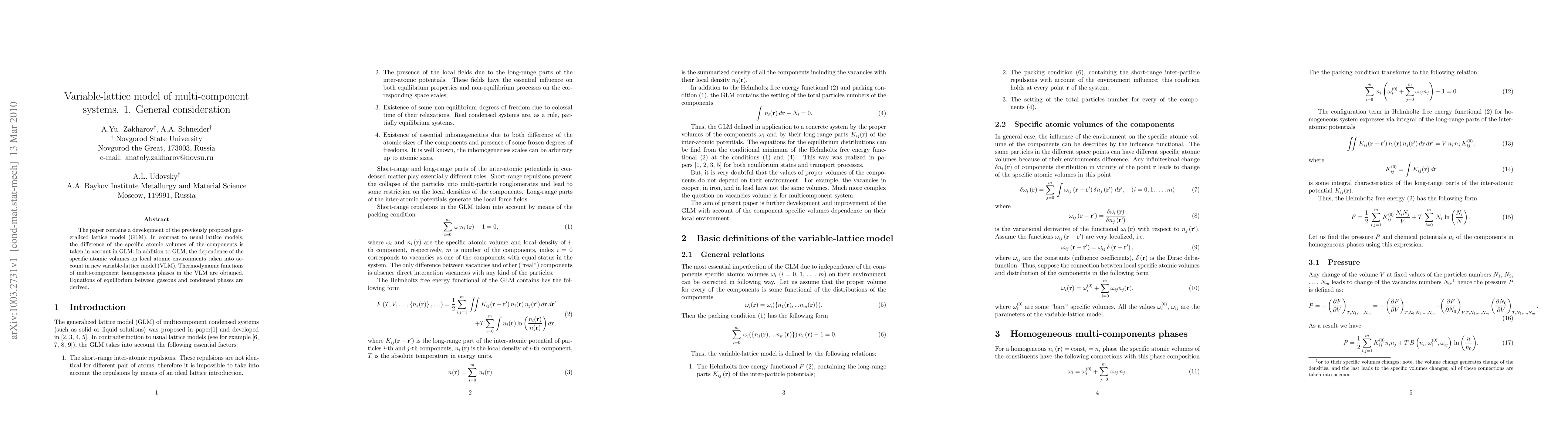 The paper contains a development of the previously proposed generalized lattice model (GLM). In contrast to usual lattice models, the difference of the specific atomic volumes of the components is taken in account in GLM. In addition to GLM, the dependence of the specific atomic volumes on local atomic environments taken into account in new variable-lattice model (VLM). Thermodynamic functions of multi-component homogeneous phases in the VLM are obtained. Equations of equilibrium between gaseous and condensed phases are derived. PACS: 05.20.-y, 05.70.-a, 82.65.+r Key Words: Lattice models, Free energy, Phase equilibrium, Long-range and short-range inter-atomic potentials