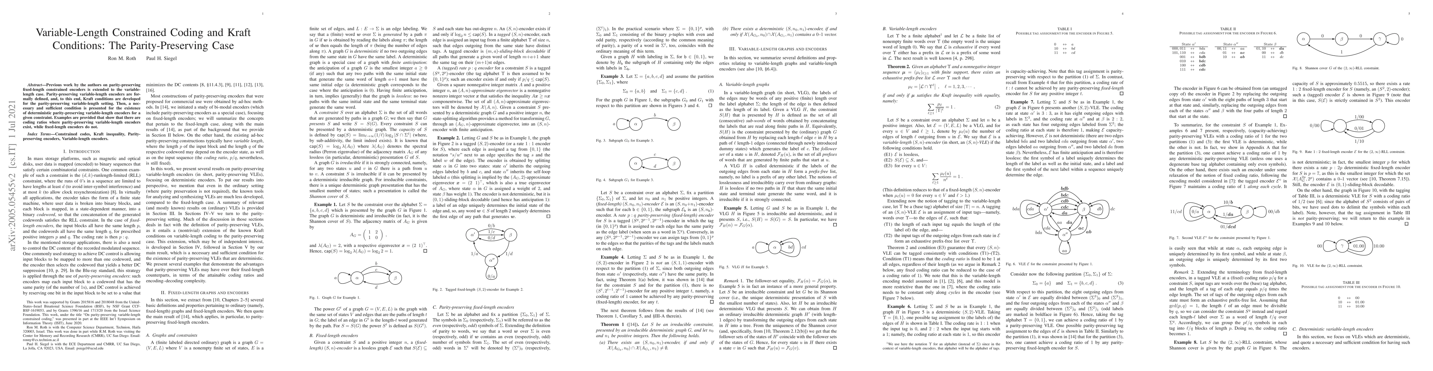 Previous work by the authors on parity-preserving fixed-length constrained encoders is extended to the variable-length case. Parity-preserving variable-length encoders are formally defined, and, to this end, Kraft conditions are developed for the parity-preserving variable-length setting. Then, a necessary and sufficient condition is presented for the existence of deterministic parity-preserving variable-length encoders for a given constraint. Examples are provided that show that there are coding ratios where parity-preserving variable-length encoders exist, while fixed-length encoders do not.