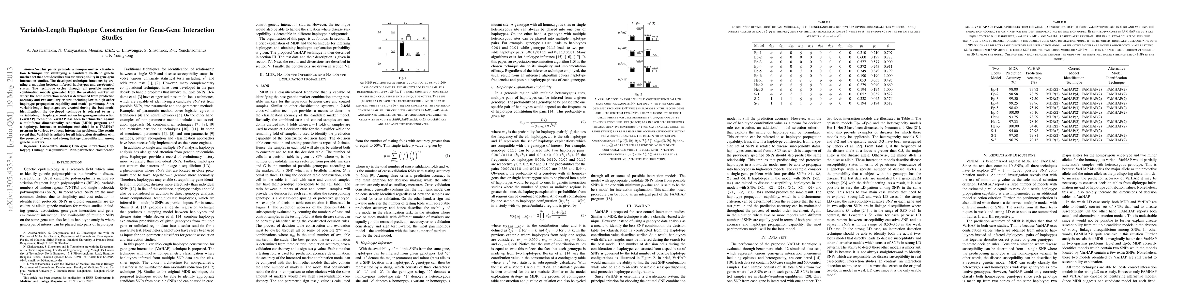 This paper presents a non-parametric classification technique for identifying a candidate bi-allelic genetic marker set that best describes disease susceptibility in gene-gene interaction studies. The developed technique functions by creating a mapping between inferred haplotypes and case/control status. The technique cycles through all possible marker combination models generated from the available marker set where the best interaction model is determined from prediction accuracy and two auxiliary criteria including low-to-high order haplotype propagation capability and model parsimony. Since variable-length haplotypes are created during the best model identification, the developed technique is referred to as a variable-length haplotype construction for gene-gene interaction (VarHAP) technique. VarHAP has been benchmarked against a multifactor dimensionality reduction (MDR) program and a haplotype interaction technique embedded in a FAMHAP program in various two-locus interaction problems. The results reveal that VarHAP is suitable for all interaction situations with the presence of weak and strong linkage disequilibrium among genetic markers.