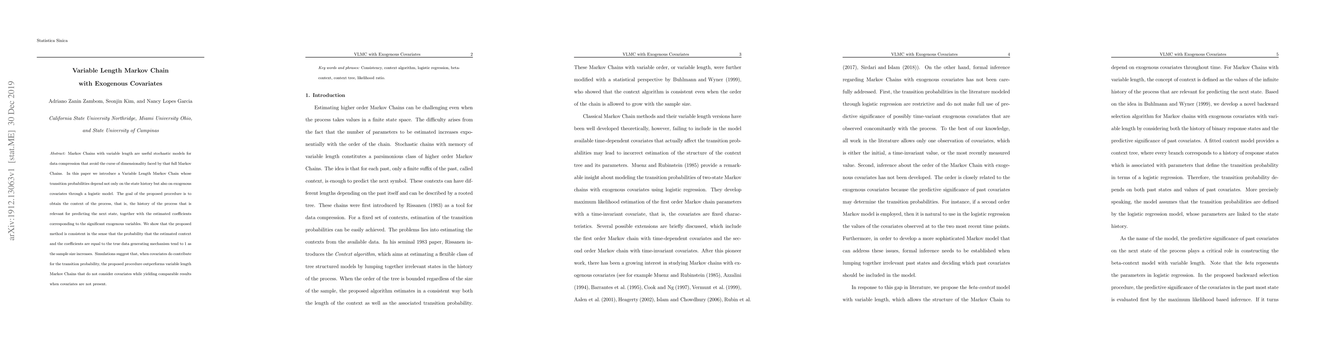 This paper proposes a Variable Length Markov Chain model incorporating exogenous covariates via a logistic model to predict transitions, aiming to better capture relevant context. The method is shown to be consistent and outperforms traditional models when covariates are significant, while maintaining comparable results when they are not.