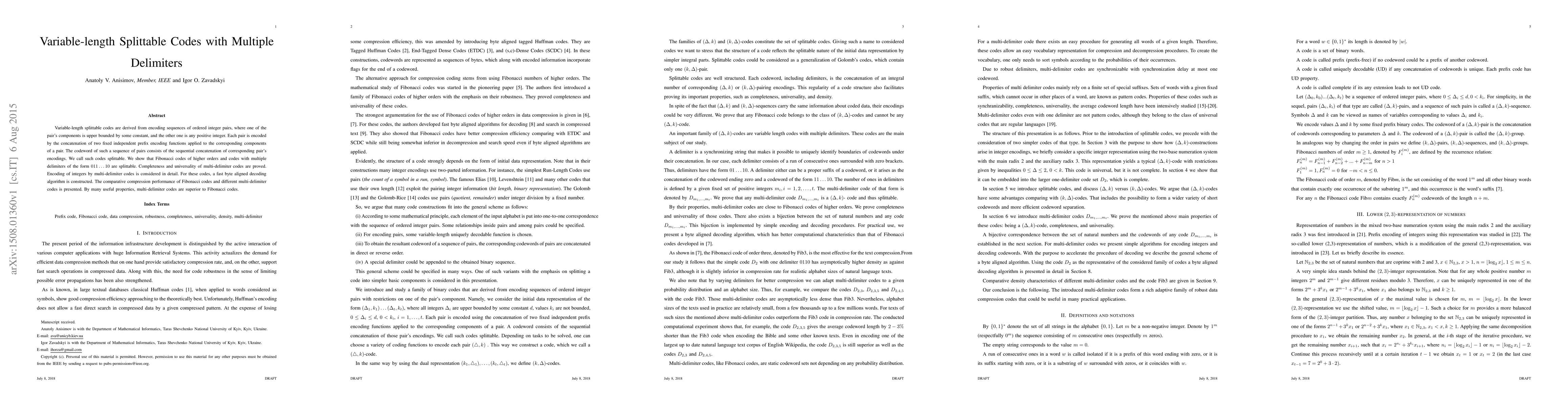 Variable-length splittable codes are derived from encoding sequences of ordered integer pairs, where one of the pair's components is upper bounded by some constant, and the other one is any positive integer. Each pair is encoded by the concatenation of two fixed independent prefix encoding functions applied to the corresponding components of a pair. The codeword of such a sequence of pairs consists of the sequential concatenation of corresponding pair's encodings. We call such codes splittable. We show that Fibonacci codes of higher orders and codes with multiple delimiters of the form 011...10 are splittable. Completeness and universality of multi-delimiter codes are proved. Encoding of integers by multi-delimiter codes is considered in detail. For these codes, a fast byte aligned decoding algorithm is constructed. The comparative compression performance of Fibonacci codes and different multi-delimiter codes is presented. By many useful properties, multi-delimiter codes are superior to Fibonacci codes.