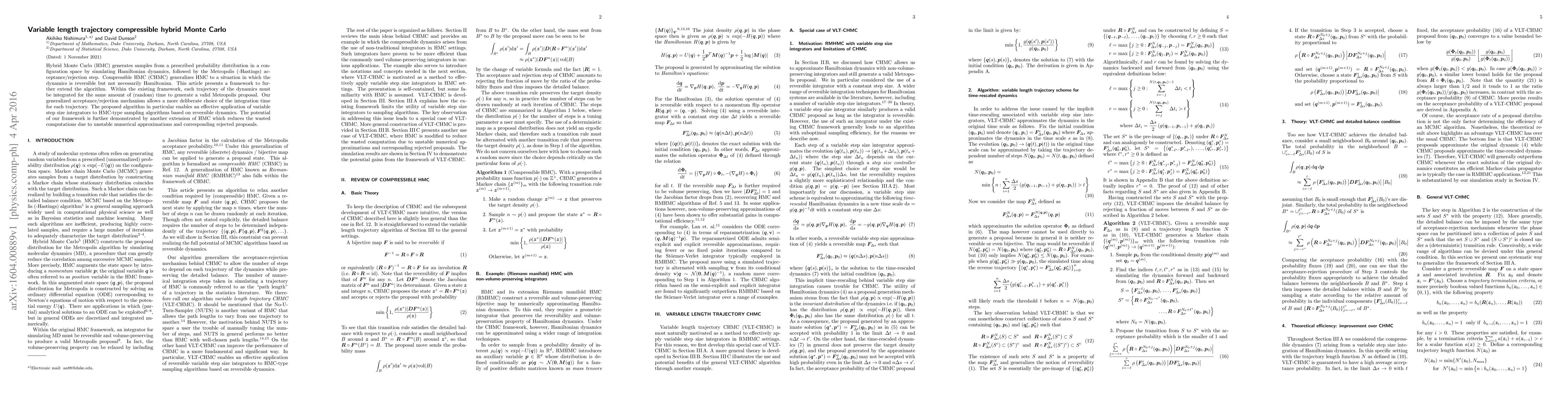 A new framework for compressible hybrid Monte Carlo extends the algorithm to allow more deliberate integration time choices, enabling effective use of variable step size integrators. This innovation reduces wasted computations from unstable numerical approximations.