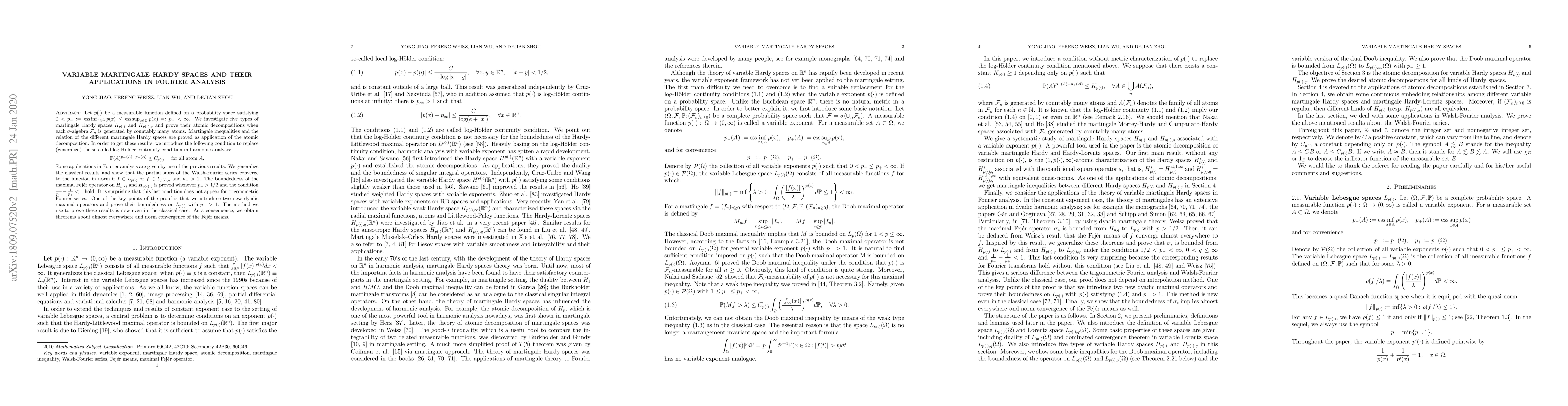 This paper explores five types of martingale Hardy spaces $H_{p(\cdot)}$ and $H_{p(\cdot),q}$ with variable exponents, proving their atomic decompositions and associated martingale inequalities. It introduces a generalized log-Hölder condition and provides applications in Fourier analysis, proving convergence of Walsh-Fourier series and boundedness of maximal Fejér operators under specific conditions.