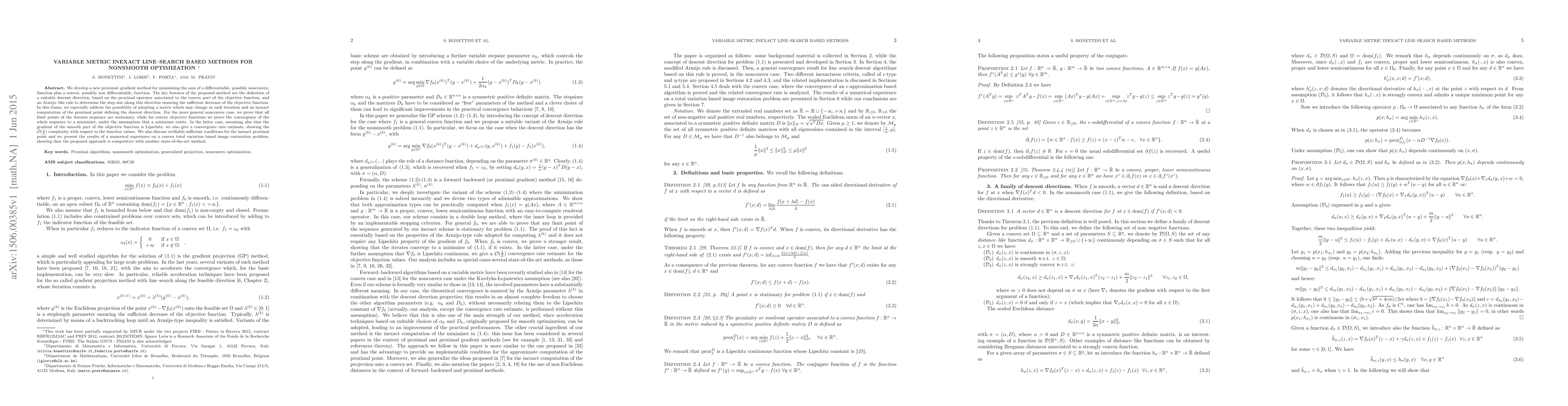 We develop a new proximal-gradient method for minimizing the sum of a differentiable, possibly nonconvex, function plus a convex, possibly non differentiable, function. The key features of the proposed method are the definition of a suitable descent direction, based on the proximal operator associated to the convex part of the objective function, and an Armijo-like rule to determine the step size along this direction ensuring the sufficient decrease of the objective function. In this frame, we especially address the possibility of adopting a metric which may change at each iteration and an inexact computation of the proximal point defining the descent direction. For the more general nonconvex case, we prove that all limit points of the iterates sequence are stationary, while for convex objective functions we prove the convergence of the whole sequence to a minimizer, under the assumption that a minimizer exists. In the latter case, assuming also that the gradient of the smooth part of the objective function is Lipschitz, we also give a convergence rate estimate, showing the O(1/k) complexity with respect to the function values. We also discuss verifiable sufficient conditions for the inexact proximal point and we present the results of a numerical experience on a convex total variation based image restoration problem, showing that the proposed approach is competitive with another state-of-the-art method.