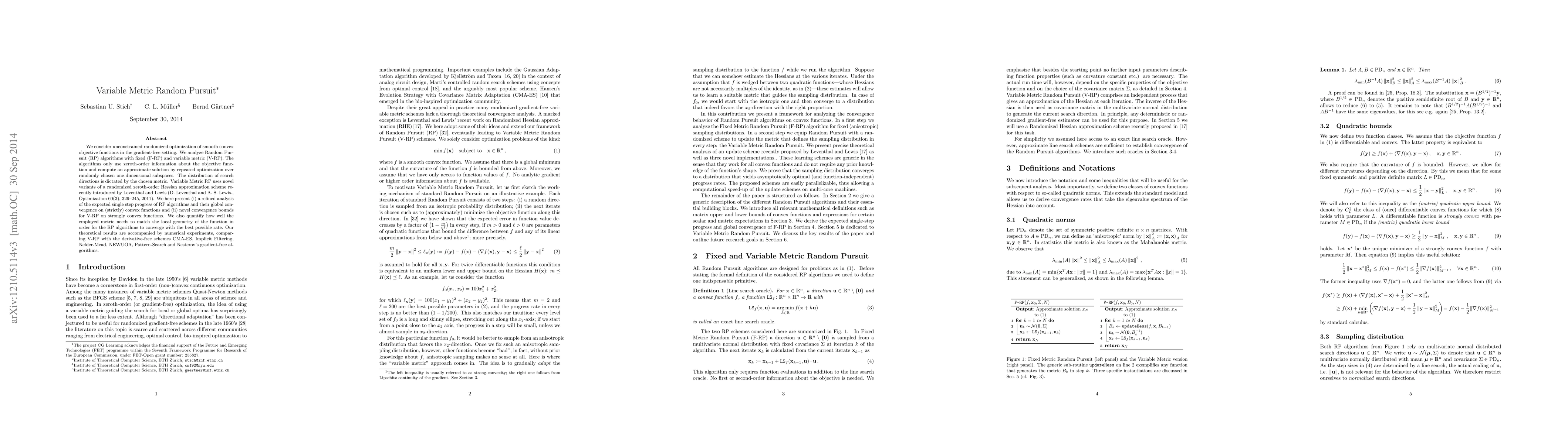 This paper analyzes Random Pursuit algorithms for gradient-free optimization of smooth convex functions, focusing on variable metric variants that use zeroth-order information. It presents refined convergence analysis and new bounds for strongly convex functions, alongside numerical comparisons to other derivative-free methods.
