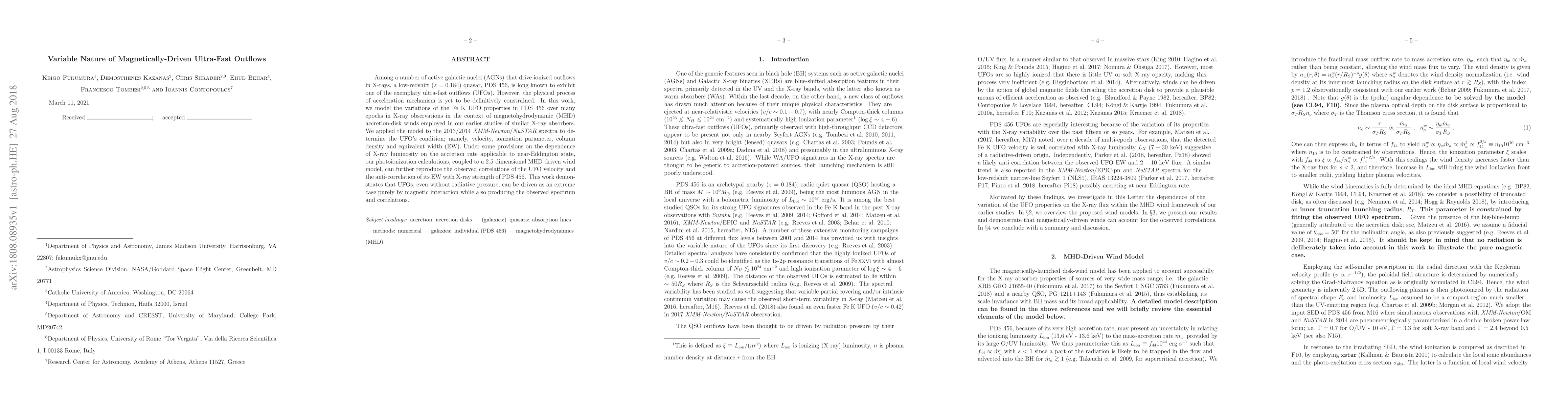 This paper investigates the variable properties of ultra-fast outflows (UFOs) in the quasar PDS 456, modeling the Fe K UFO variations over multiple X-ray observation epochs using magnetohydrodynamic accretion-disk winds. The study finds that UFOs can be driven purely by magnetic interactions, producing observed spectral correlations without requiring radiative pressure.