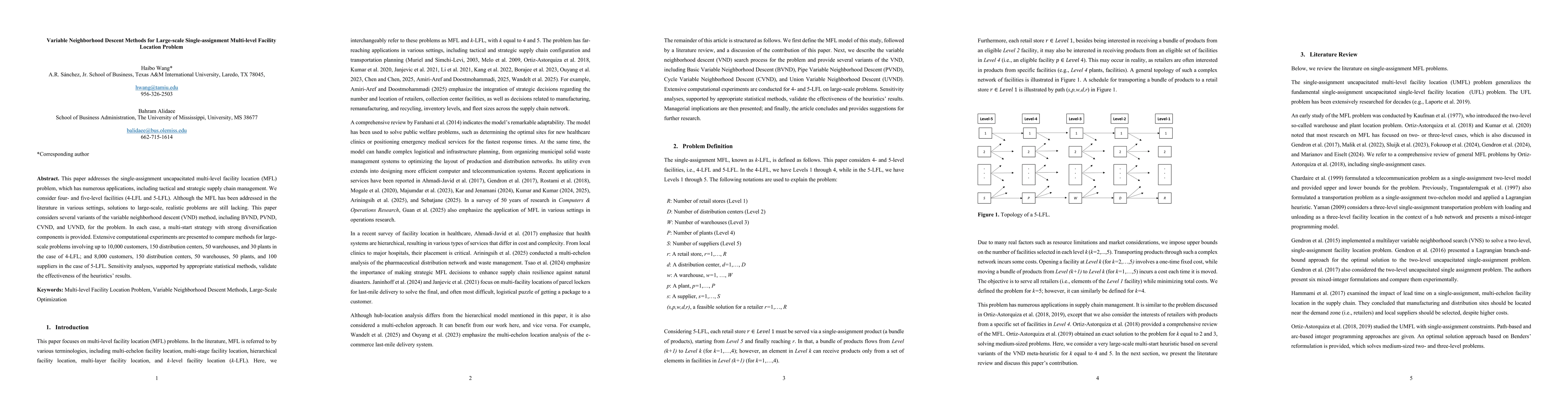 This paper addresses the single--assignment uncapacitated multi-level facility location (MFL) problem, which has numerous applications, including tactical and strategic supply chain management. We consider four-level and five-level facilities (4-LFL and 5-LFL). Although the MFL has been addressed in the literature in various settings, solutions to large-scale, realistic problems are still lacking. This paper considers several variants of the variable neighborhood descent (VND) method, including BVND, PVND, CVND, and UVND, for the problem. In each case, a multi-start strategy with strong diversification components is provided. Extensive computational experiments are presented to compare methods for large-scale problems involving up to 10,000 customers, 150 distribution centers, 50 warehouses, and 30 plants in the case of 4-LFL; and 8,000 customers, 150 distribution centers, 50 warehouses, 50 plants, and 100 suppliers in the case of 5-LFL. Sensitivity analyses, supported by appropriate statistical methods, validate the effectiveness of the heuristics' results.