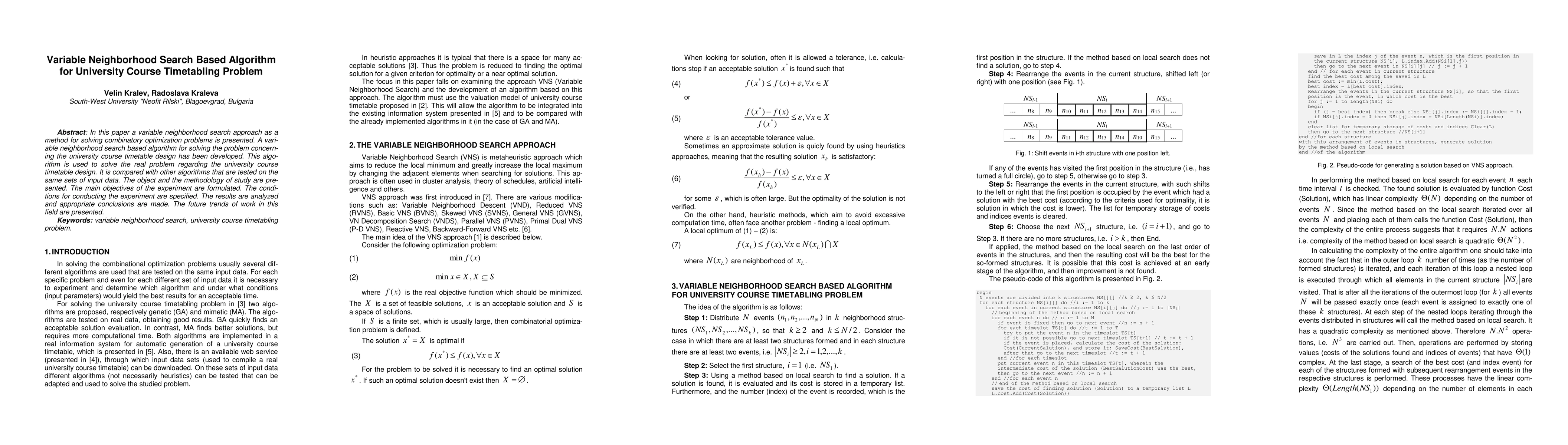 In this paper a variable neighborhood search approach as a method for solving combinatoric optimization problems is presented. A variable neighborhood search based algorithm for solving the problem concerning the university course timetable design has been developed. This algorithm is used to solve the real problem regarding the university course timetable design. It is compared with other algorithms that are tested on the same sets of input data. The object and the methodology of study are presented. The main objectives of the experiment are formulated. The conditions for conducting the experiment are specified. The results are analyzed and appropriate conclusions are made. The future trends of work in this field are presented.