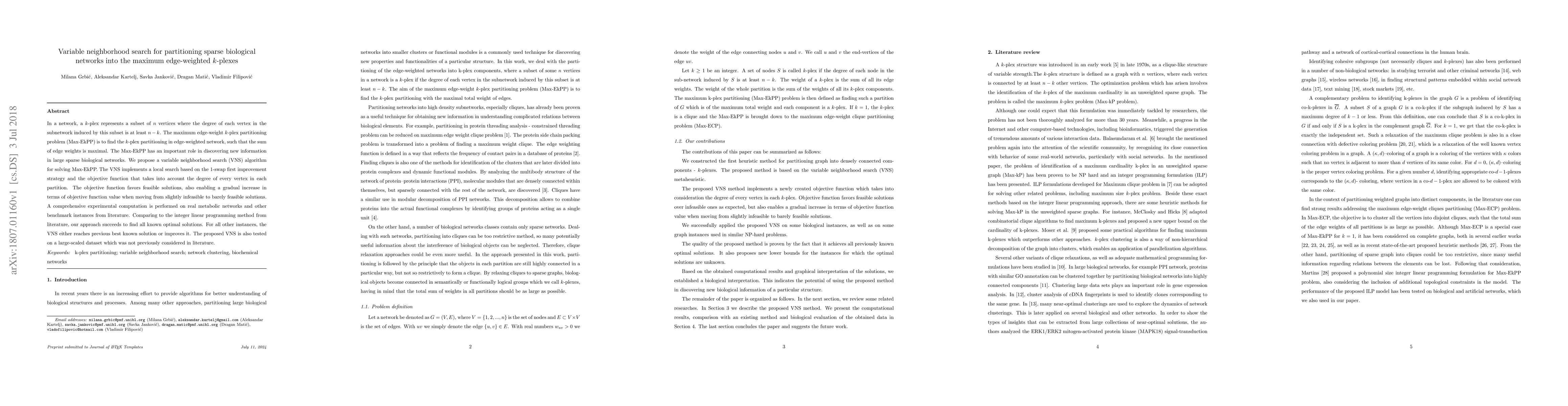 The paper proposes a variable neighborhood search (VNS) algorithm to solve the maximum edge-weight $k$-plex partitioning problem (Max-EkPP) in sparse biological networks, achieving optimal or near-optimal solutions on real metabolic networks and benchmark instances. The VNS method uses local search with a 1-swap first improvement strategy and an objective function that considers vertex degrees in each partition.